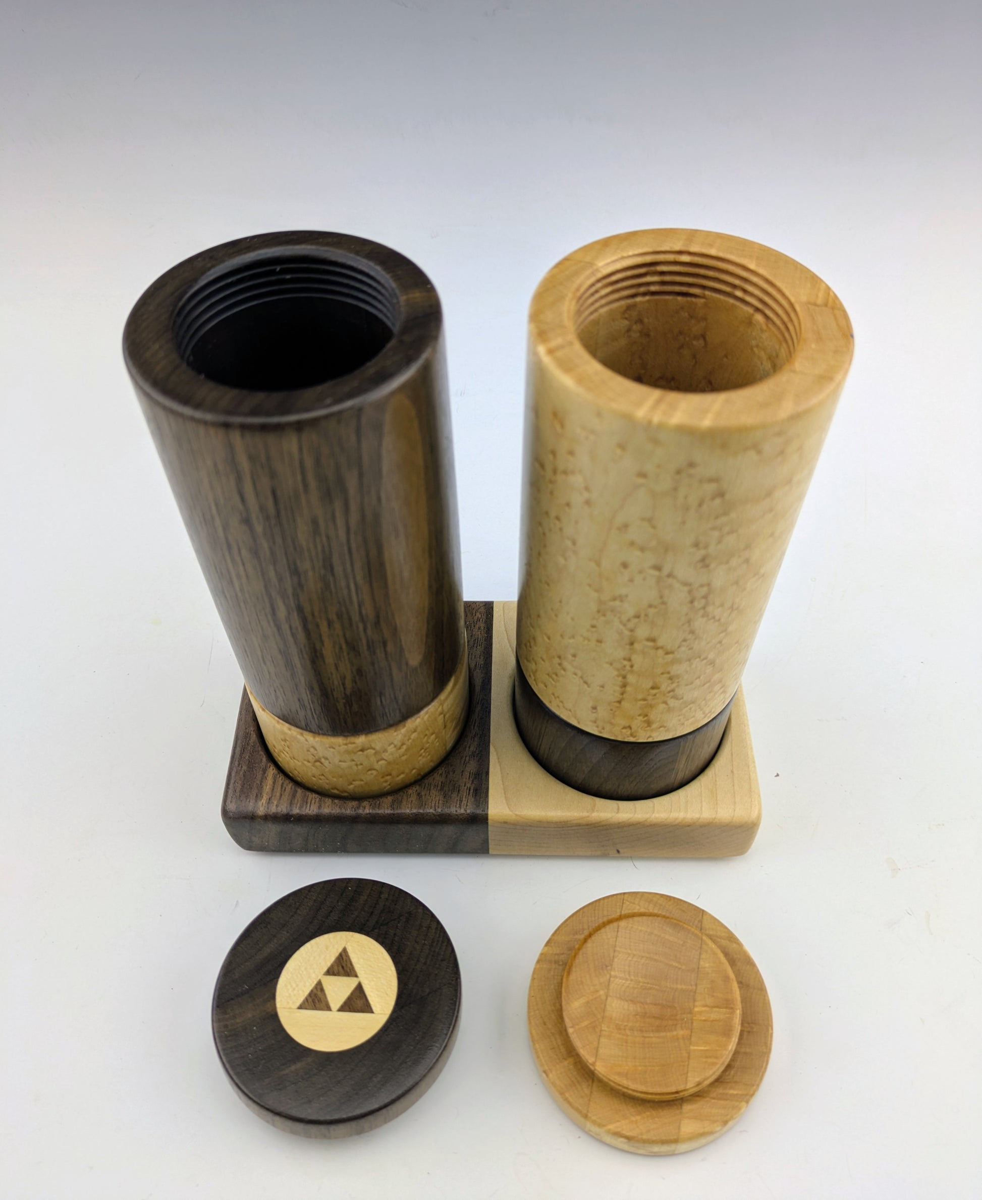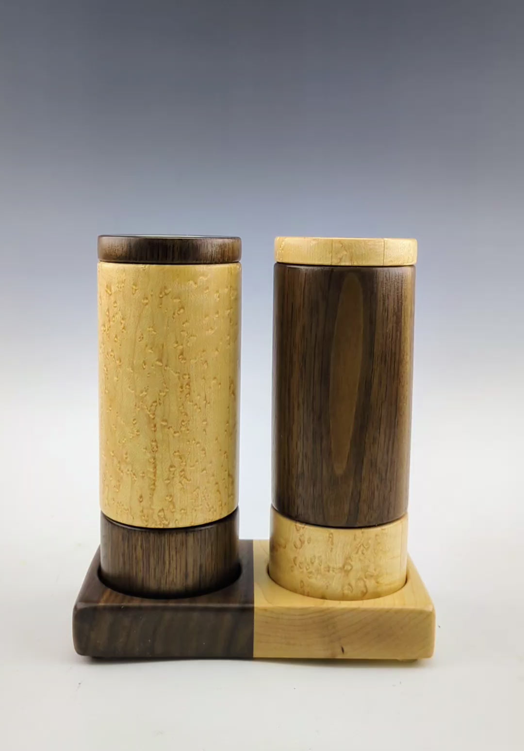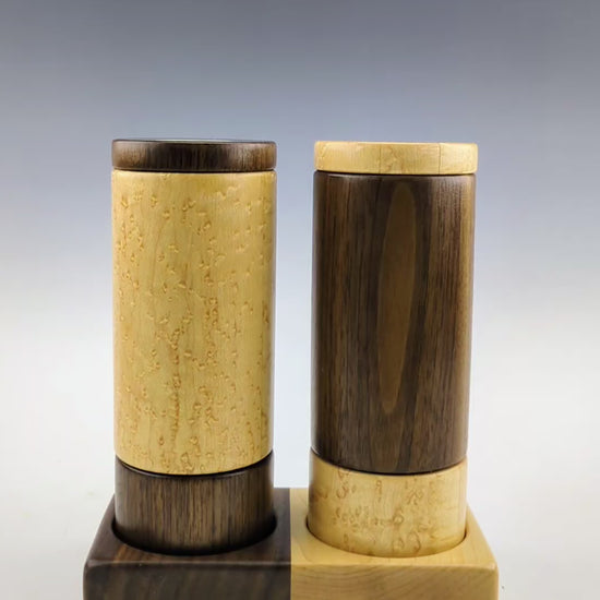 Spice grinder set made of birdseye maple and walnut. I use the Crushgrind ceramic mechanism in all my spice grinders. It is adjustable, and grinds a variety of spices including peppercorn and rock salt.