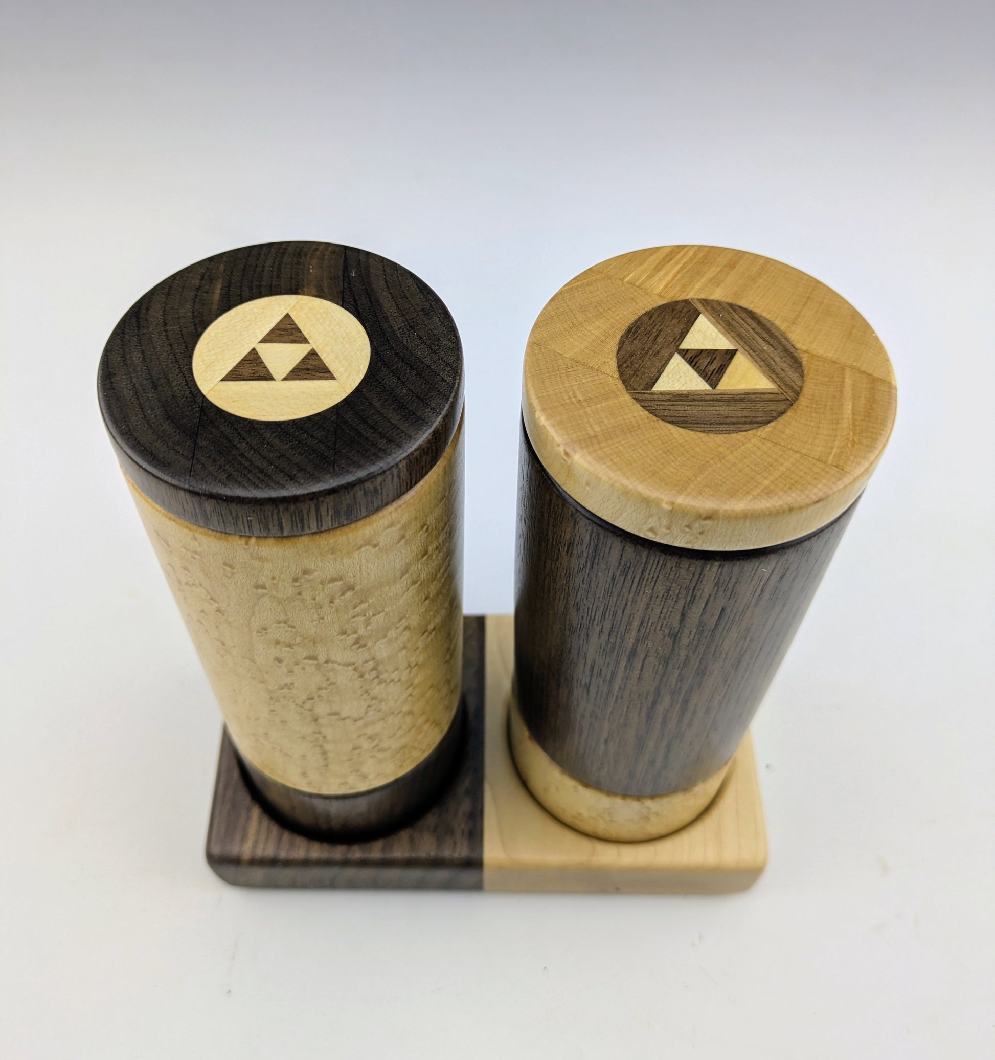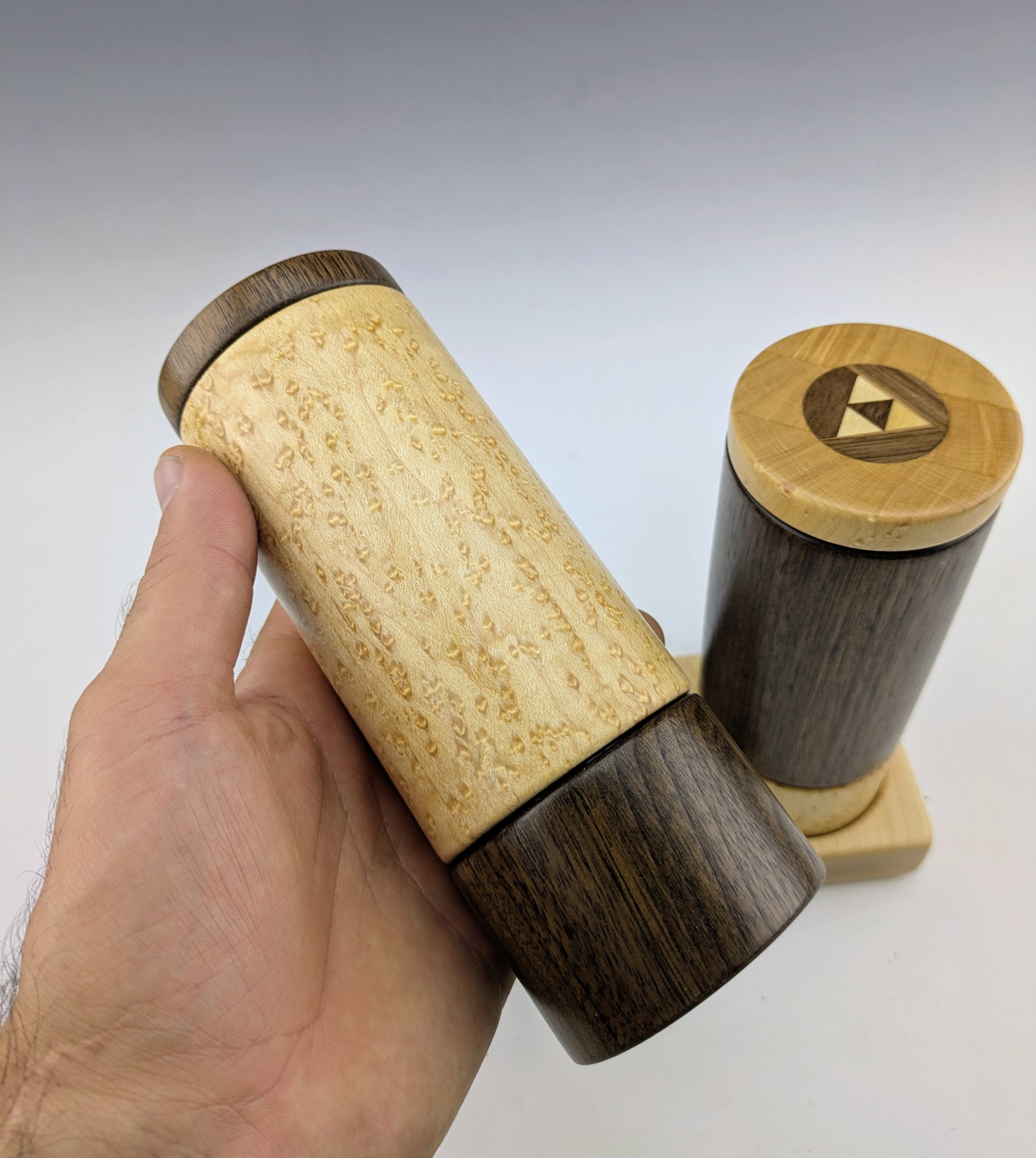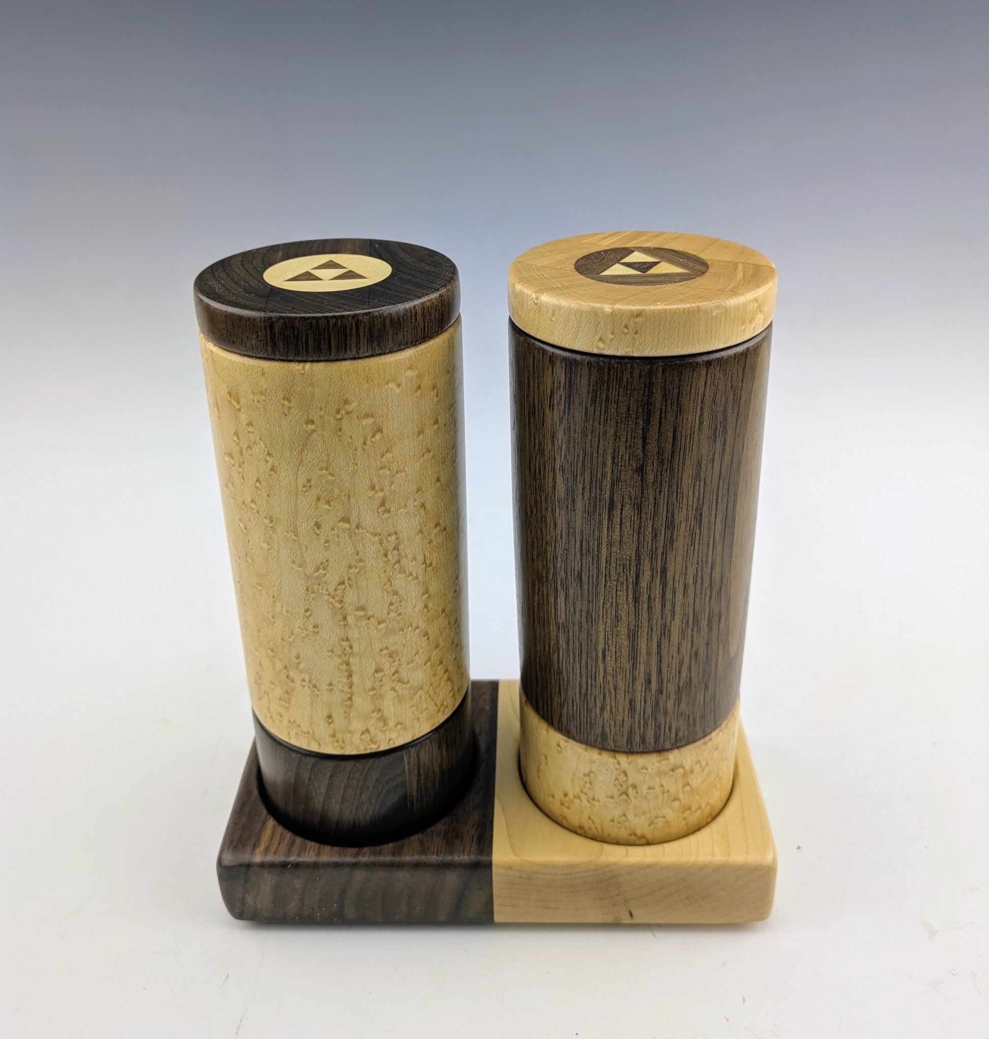 Spice grinder set made of birdseye maple and walnut. I use the Crushgrind ceramic mechanism in all my spice grinders. It is adjustable, and grinds a variety of spices including peppercorn and rock salt.