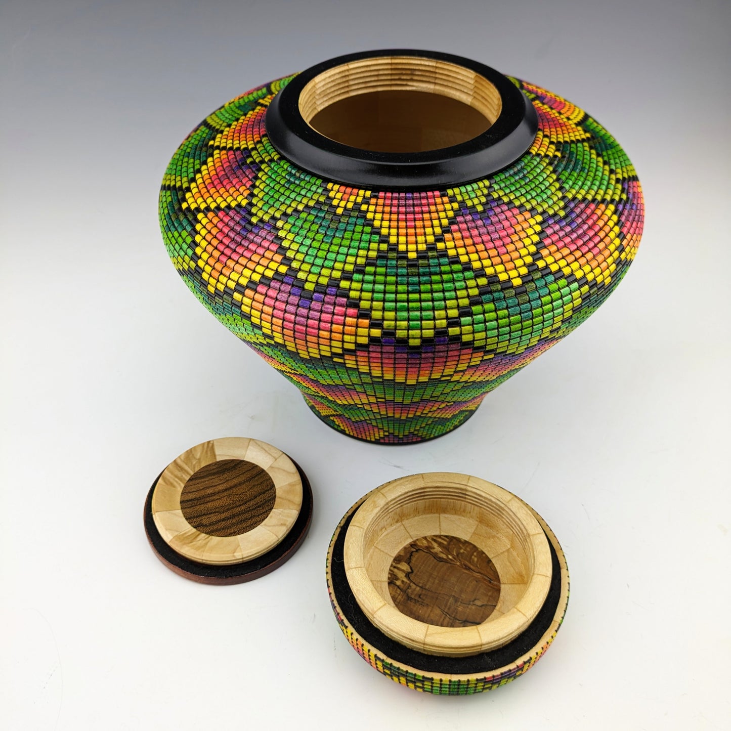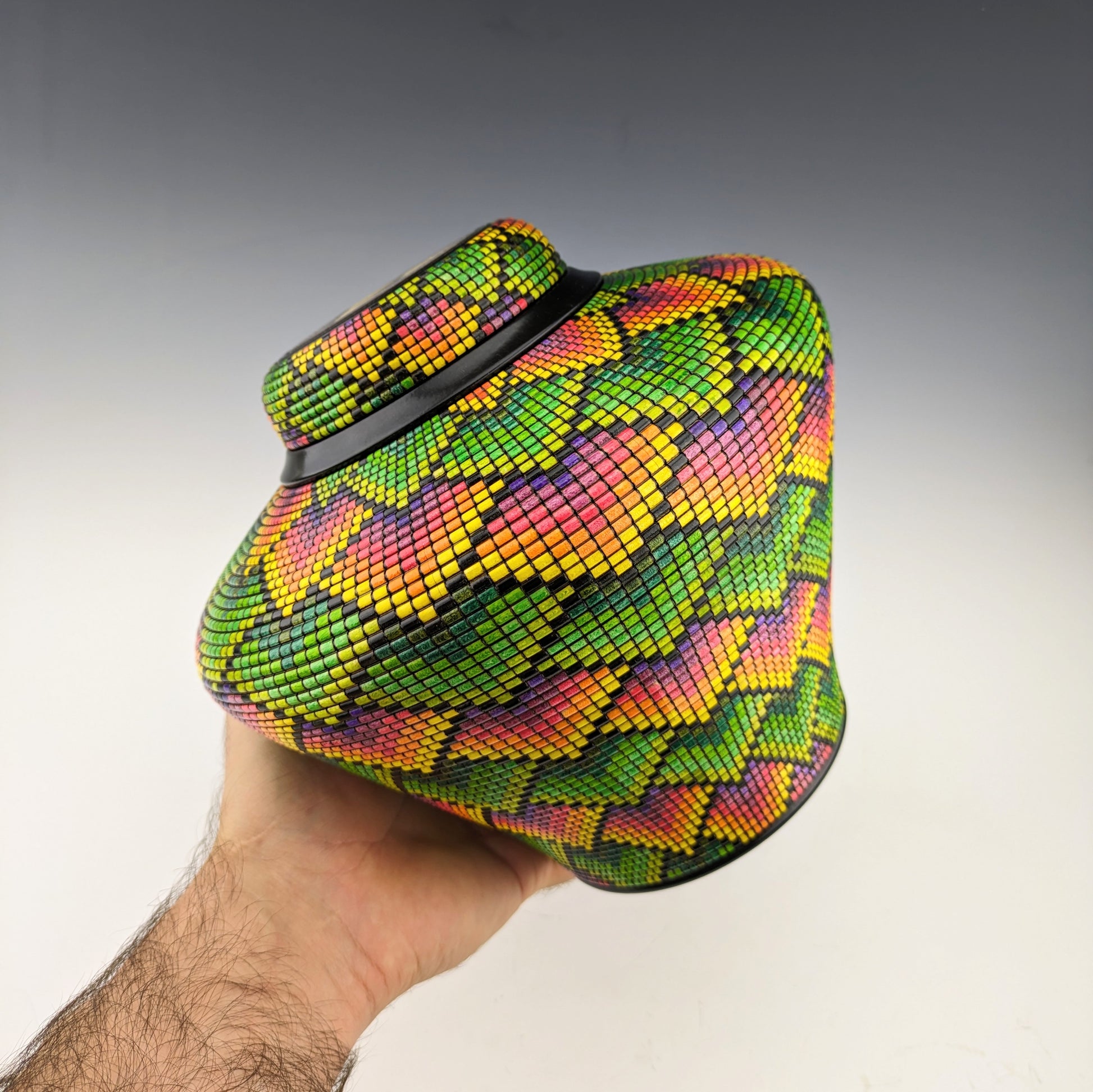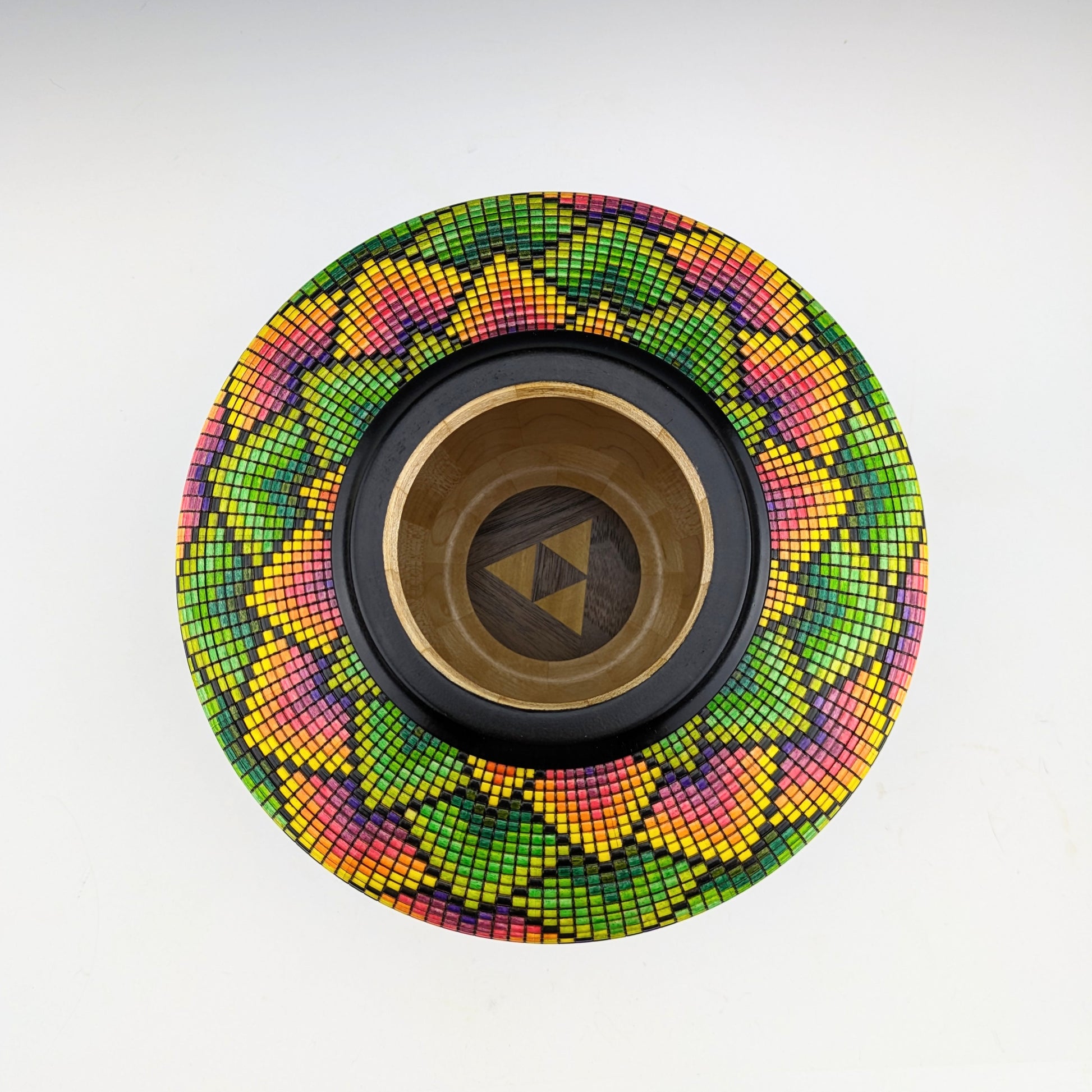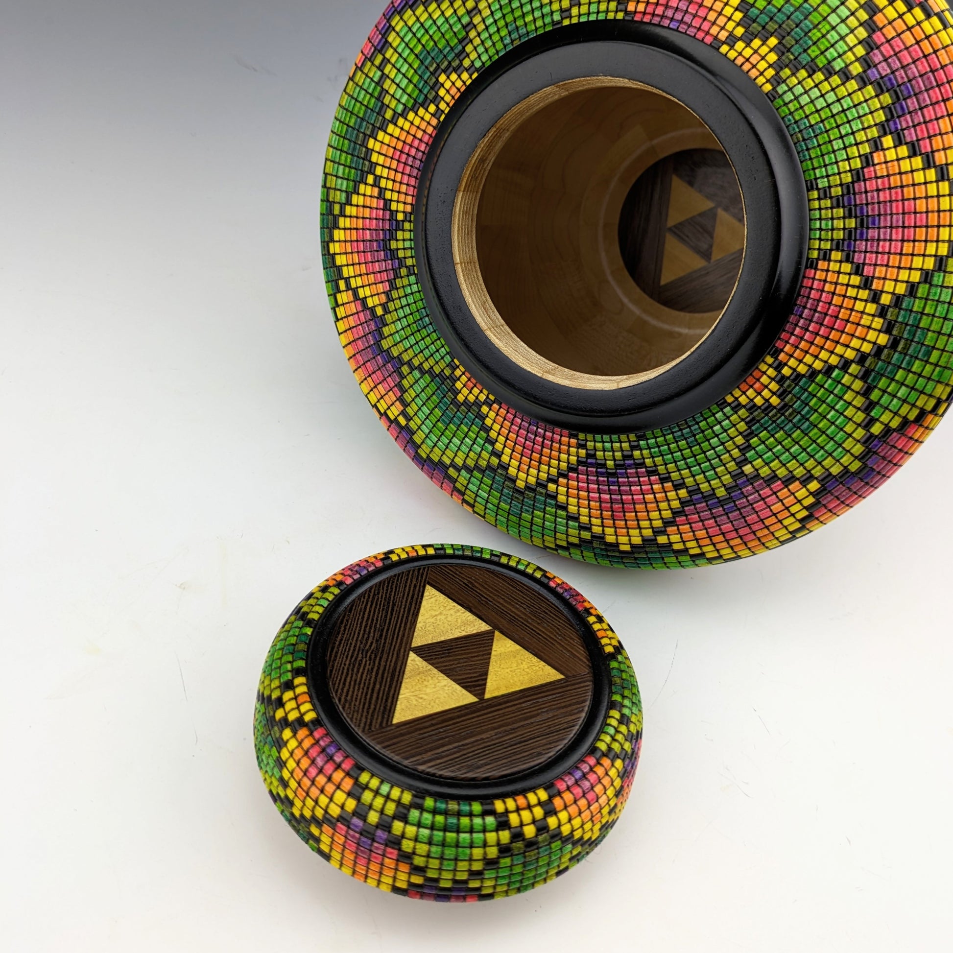 Pixelized vase made of maple, wenge and yellowheart.