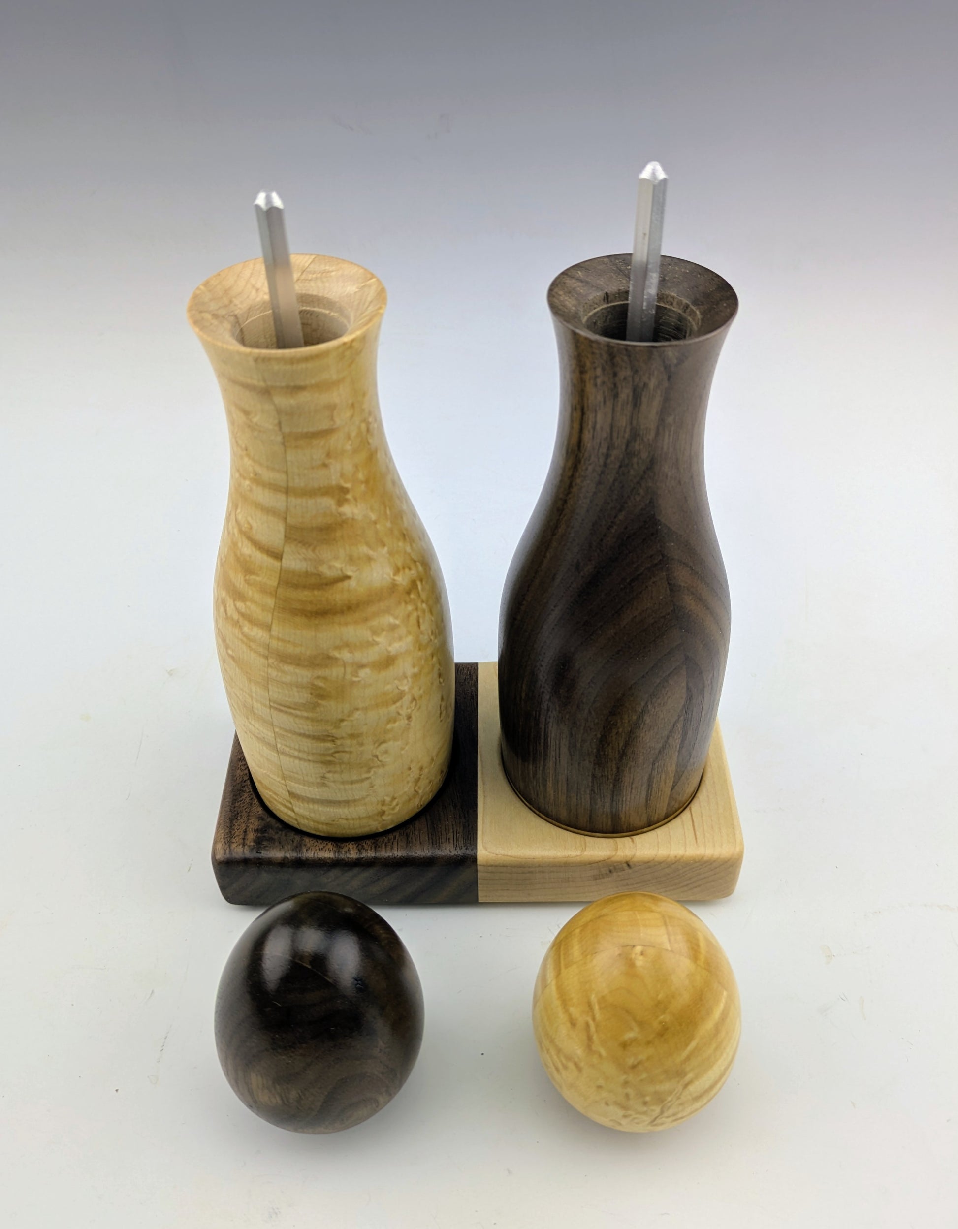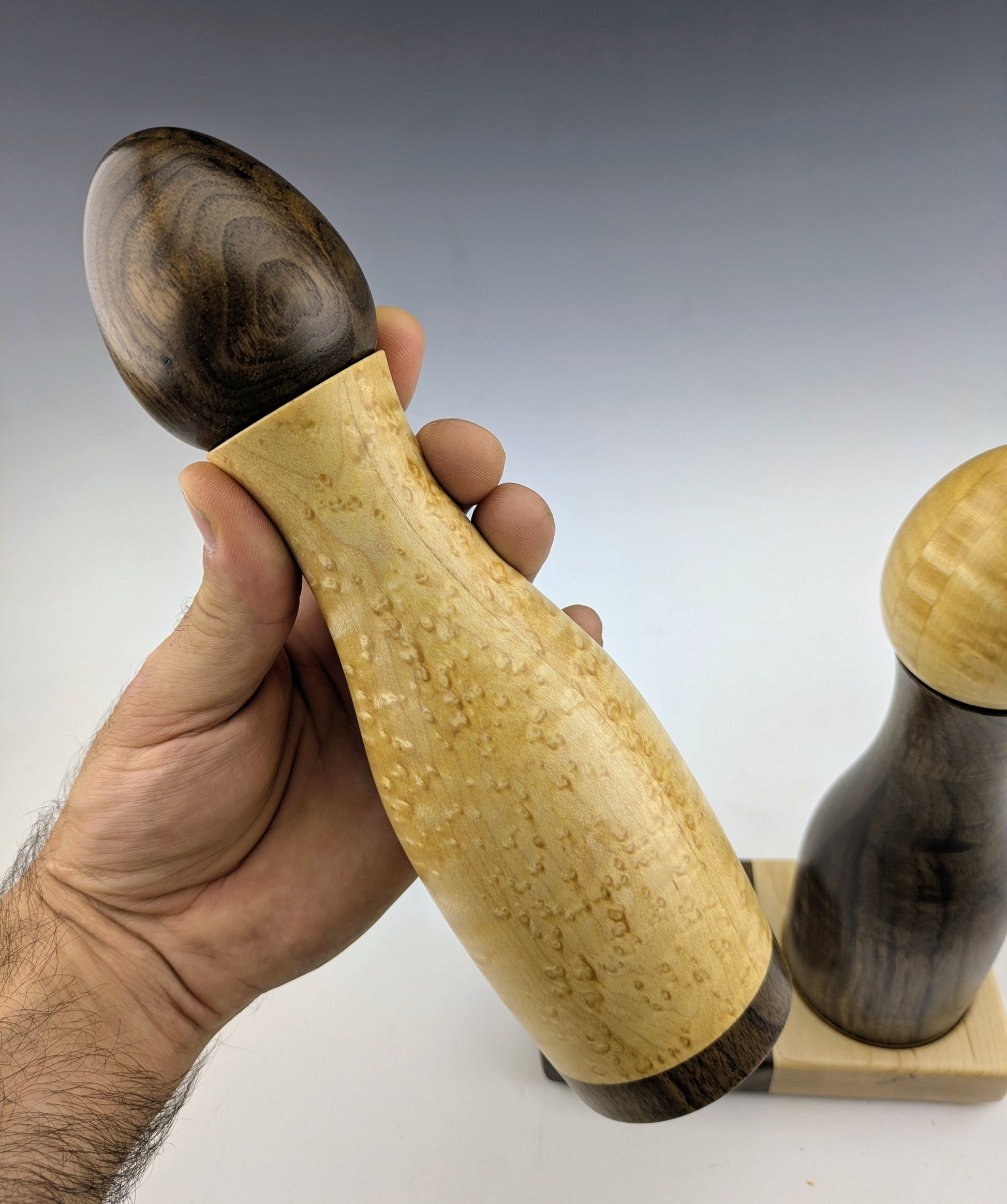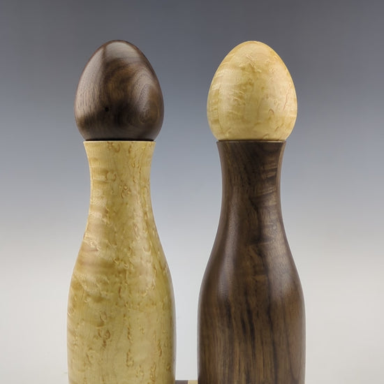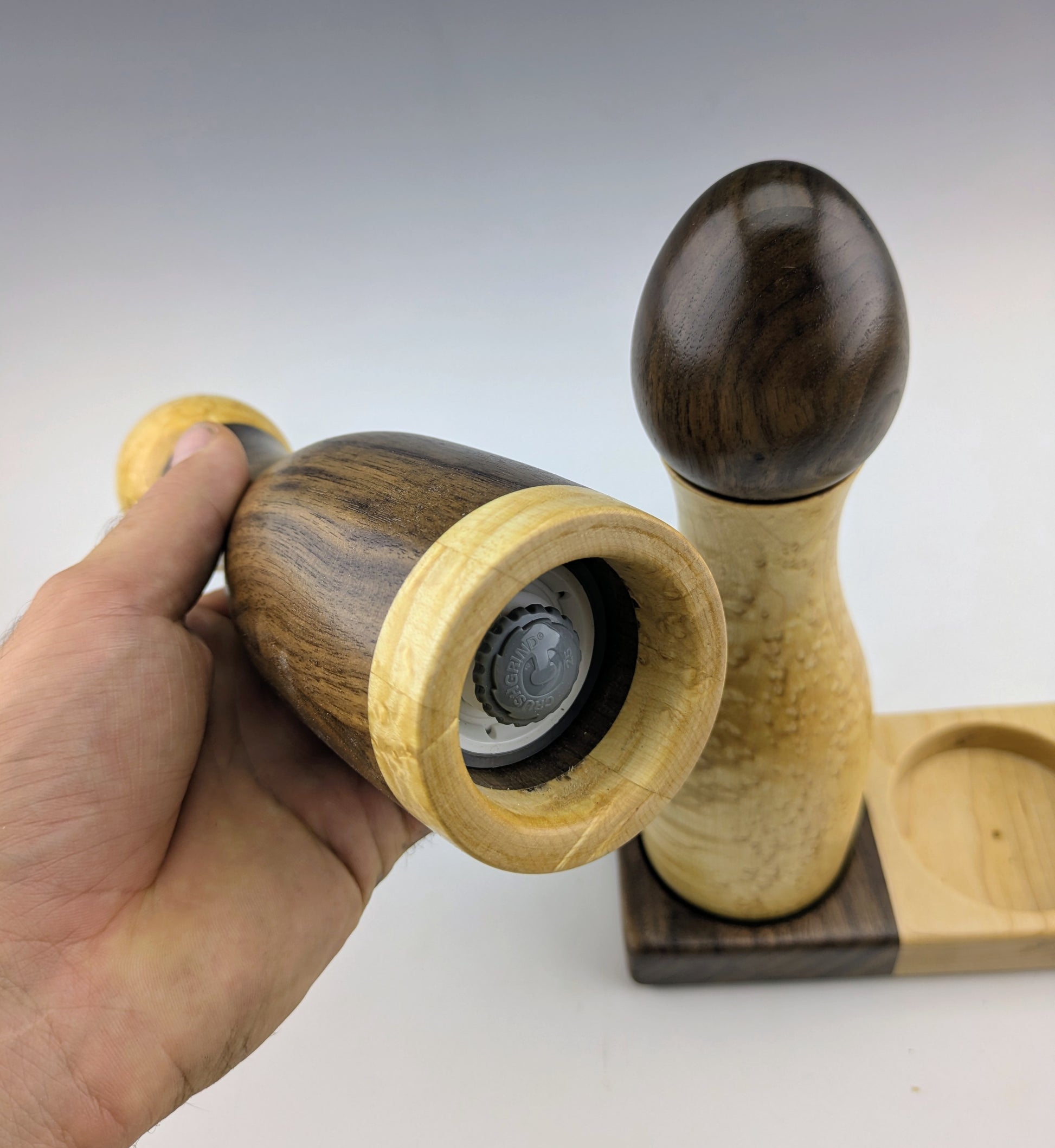 Spice grinder set made of birdseye maple and walnut. I use the Crushgrind ceramic mechanism in all my spice grinders. It is adjustable, and grinds a variety of spices including peppercorn and rock salt.