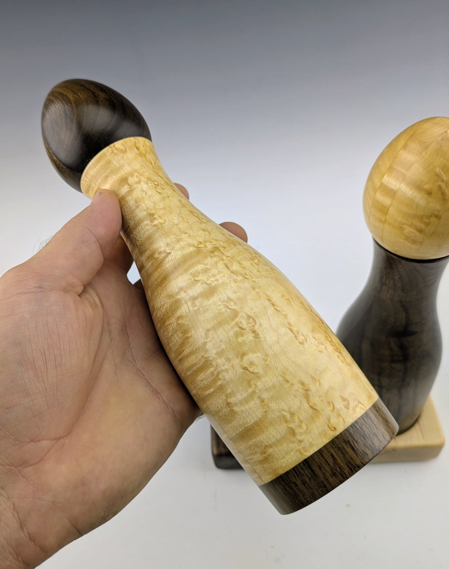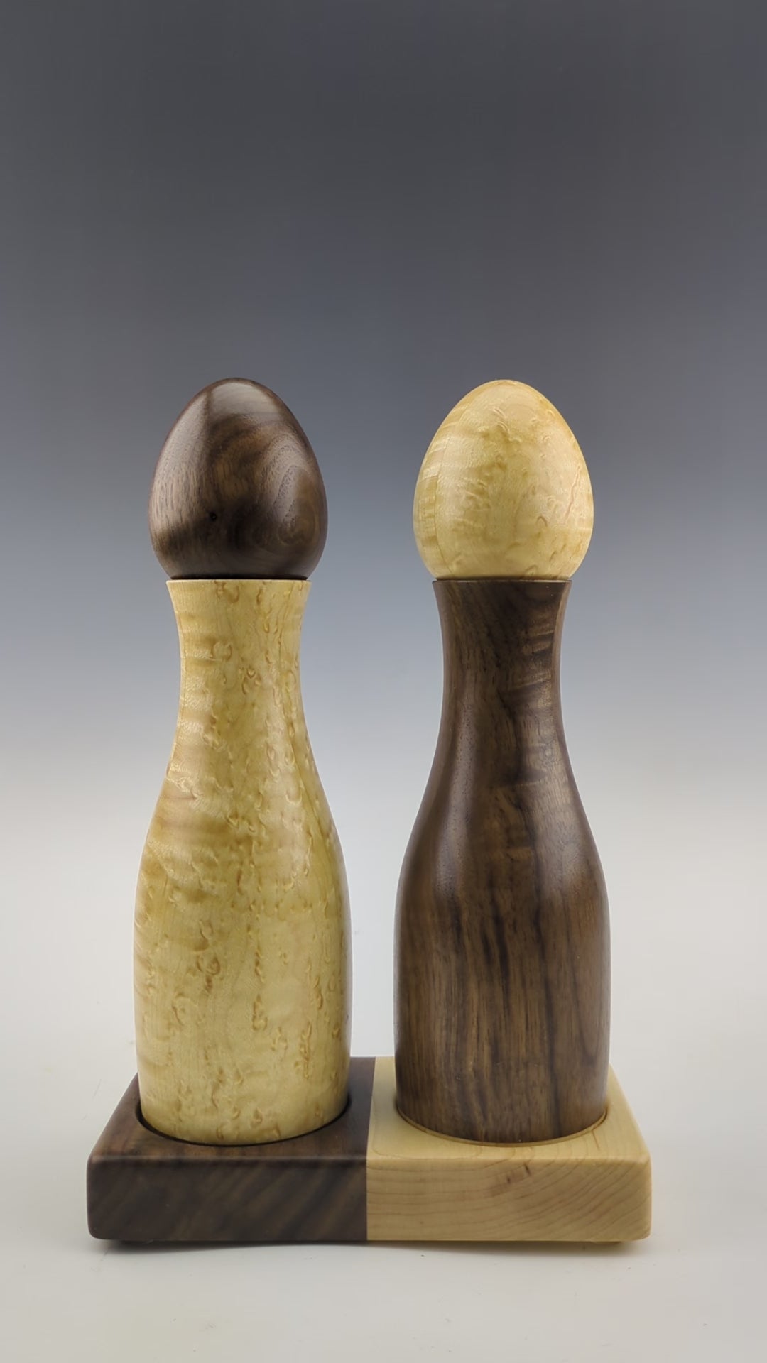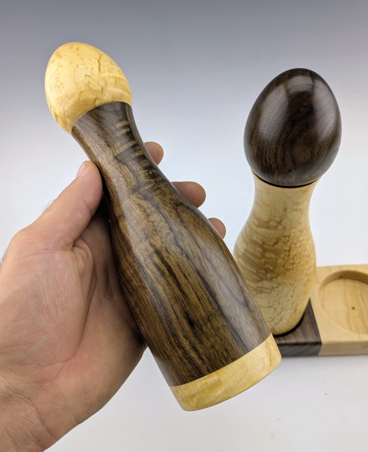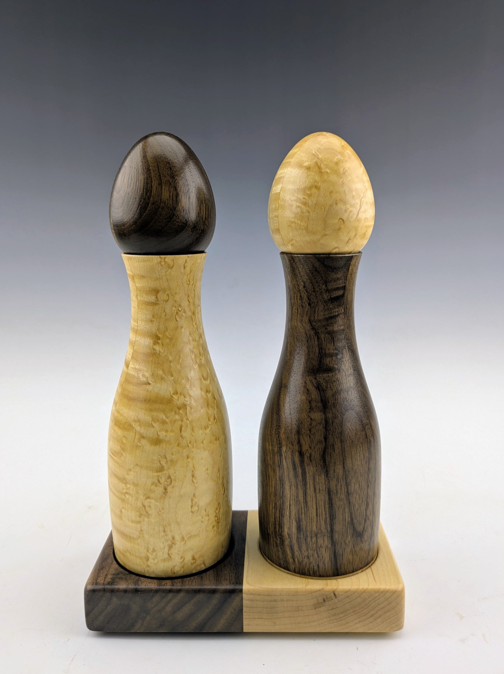 Spice grinder set made of birdseye maple and walnut. I use the Crushgrind ceramic mechanism in all my spice grinders. It is adjustable, and grinds a variety of spices including peppercorn and rock salt.