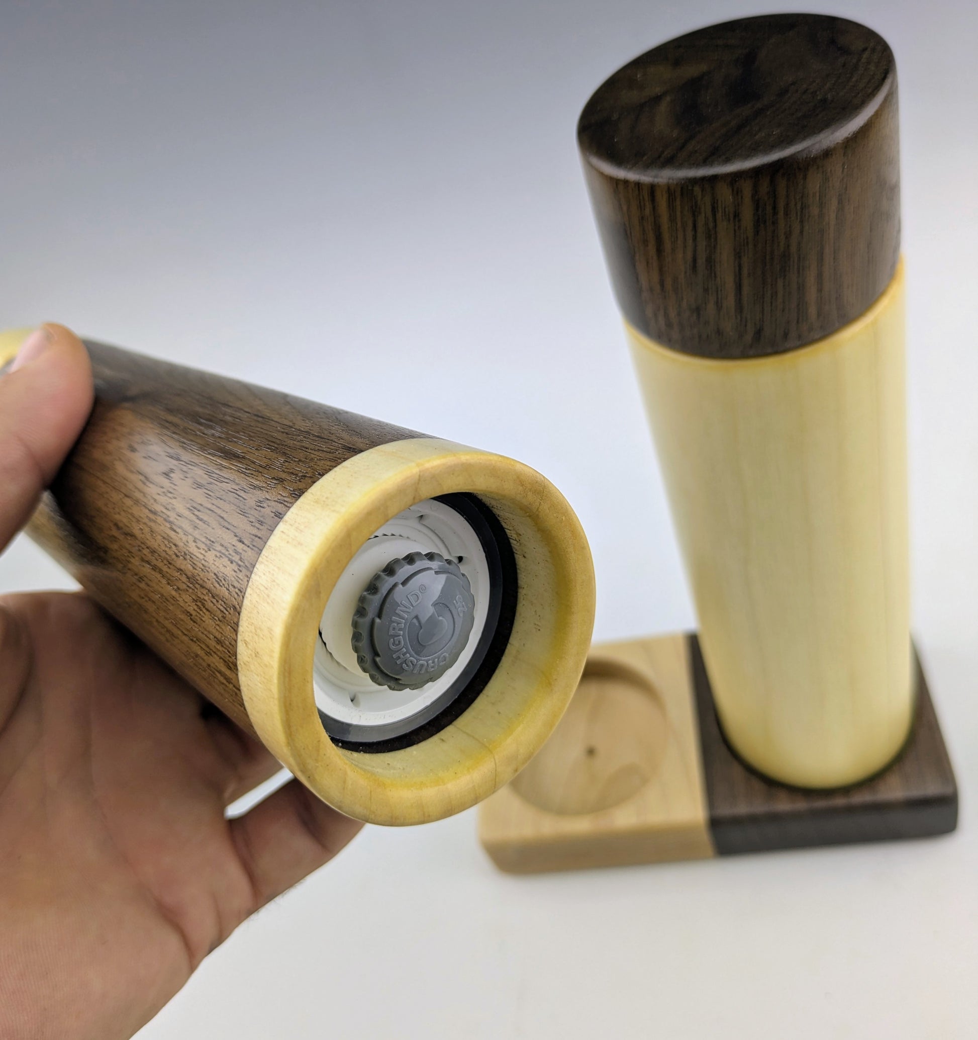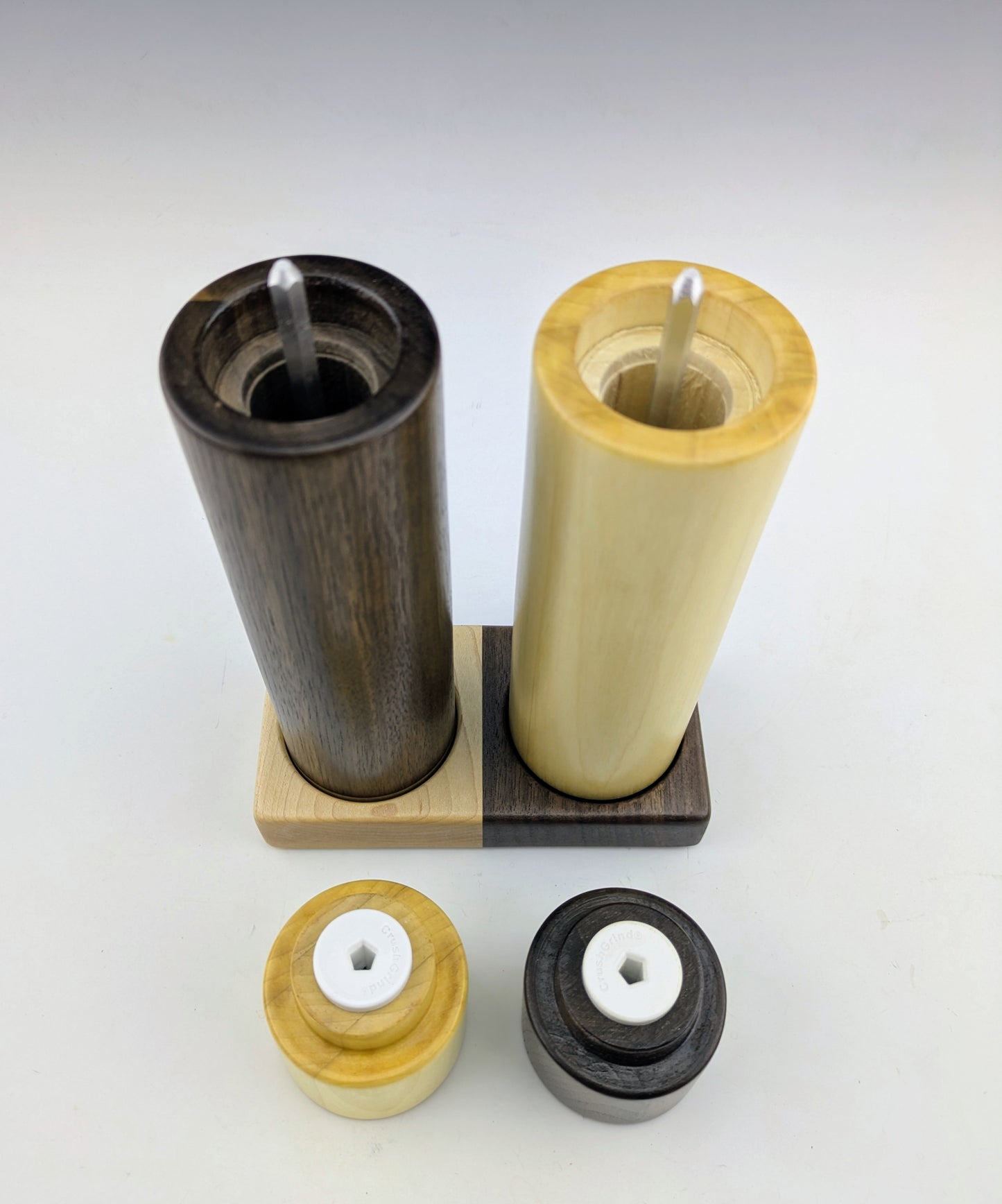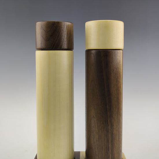 Moulins à épices fait de tremble, noyer et érable. J'utilise le mecanisme en céramique de marque Crushgrind dans tous mes moulins à épices. Ils sont ajustables et mouent une variétée d'épices, incluant les grains de poivre et le sel en gros cristaux.