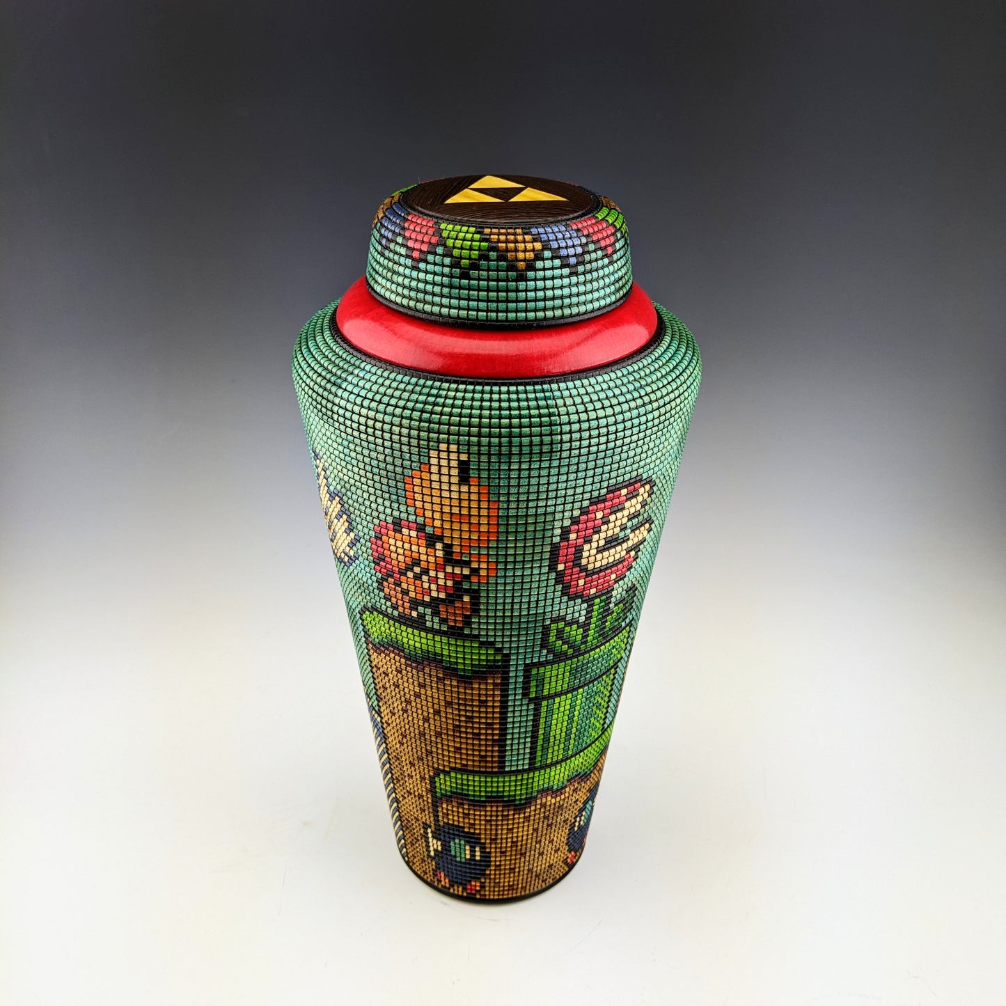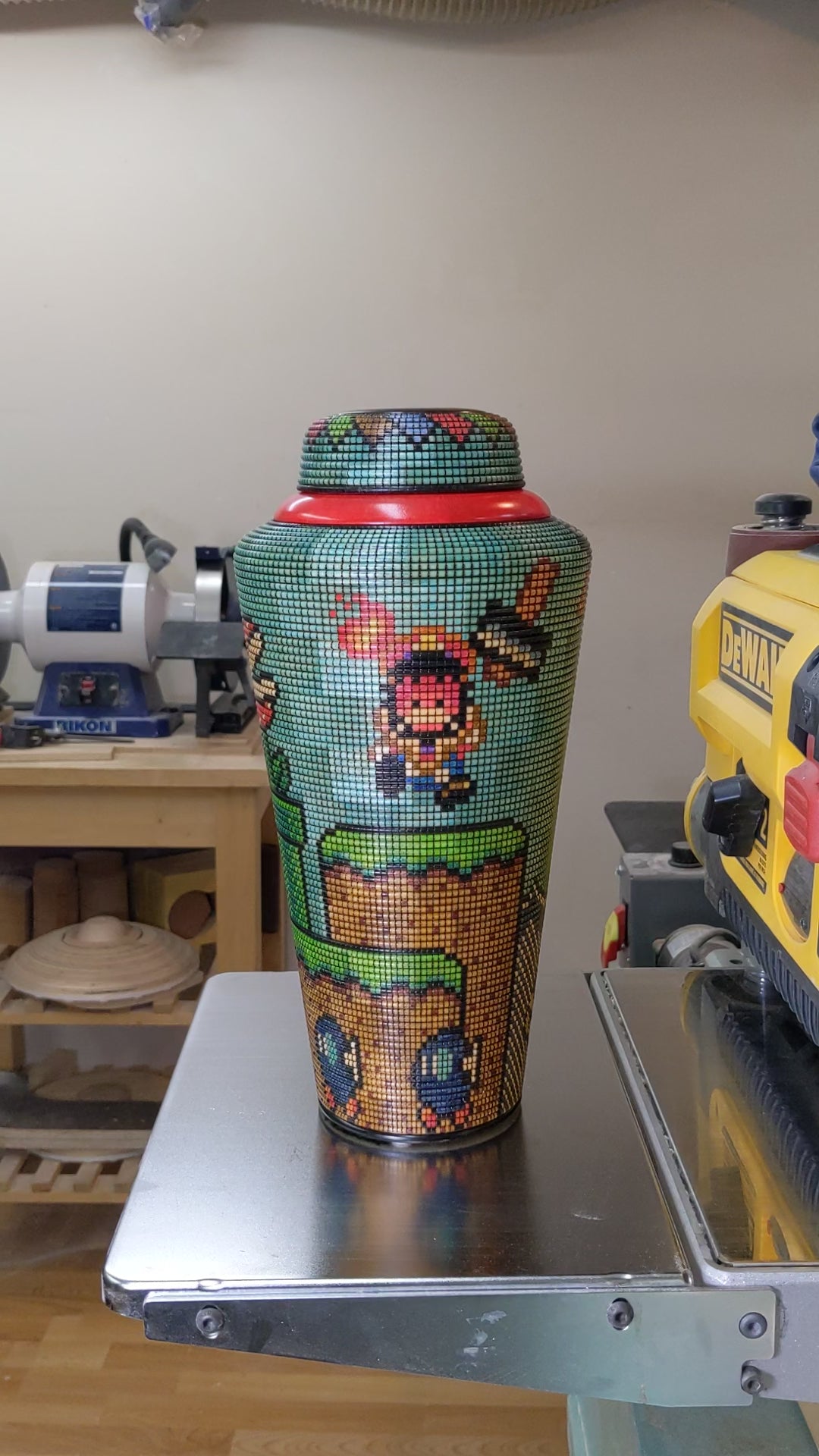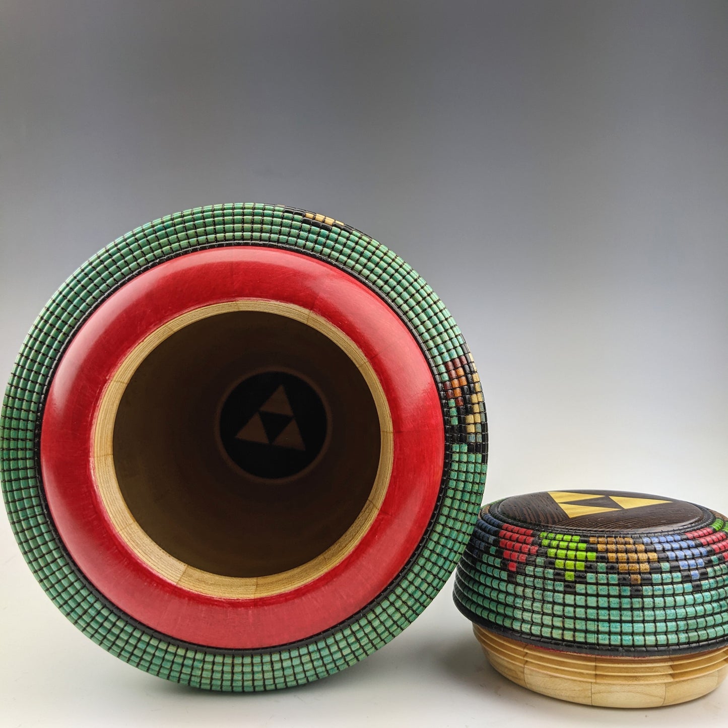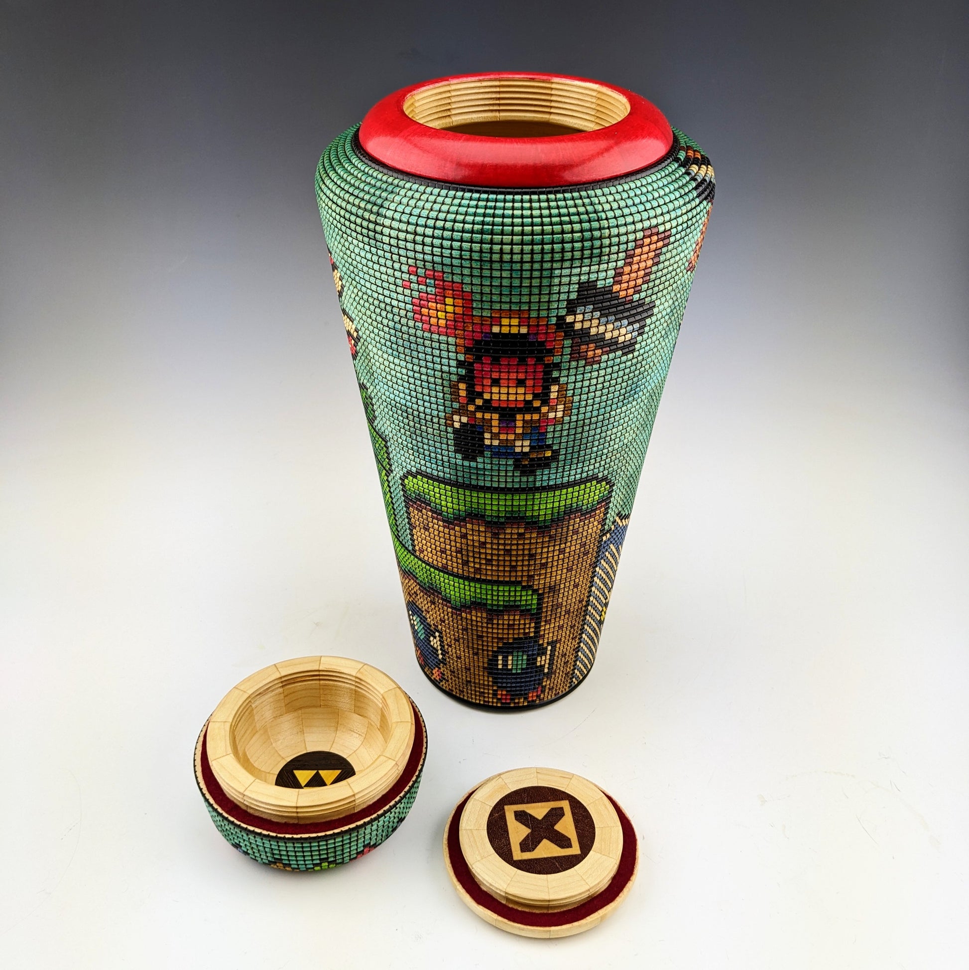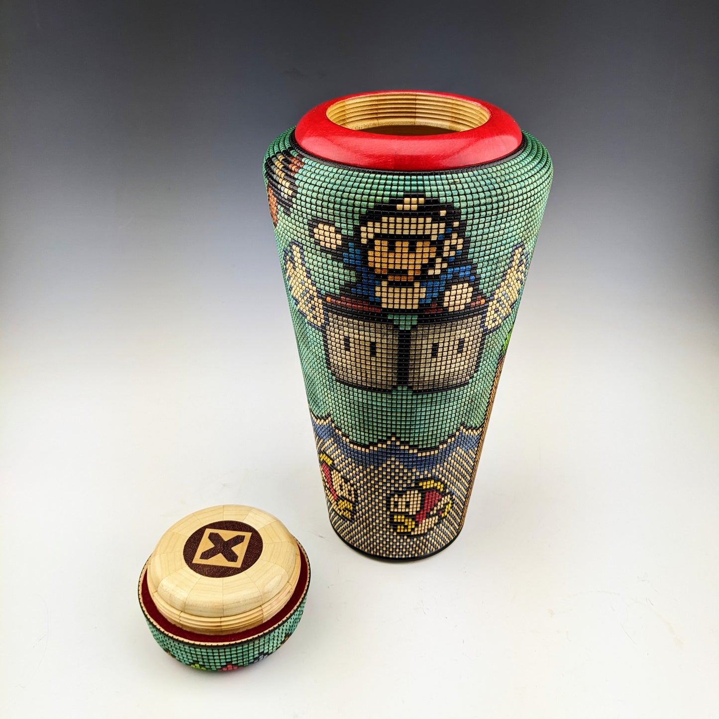 Vase pixelisé avec boite cachée, fait d'érable, wengé et pau amarello.