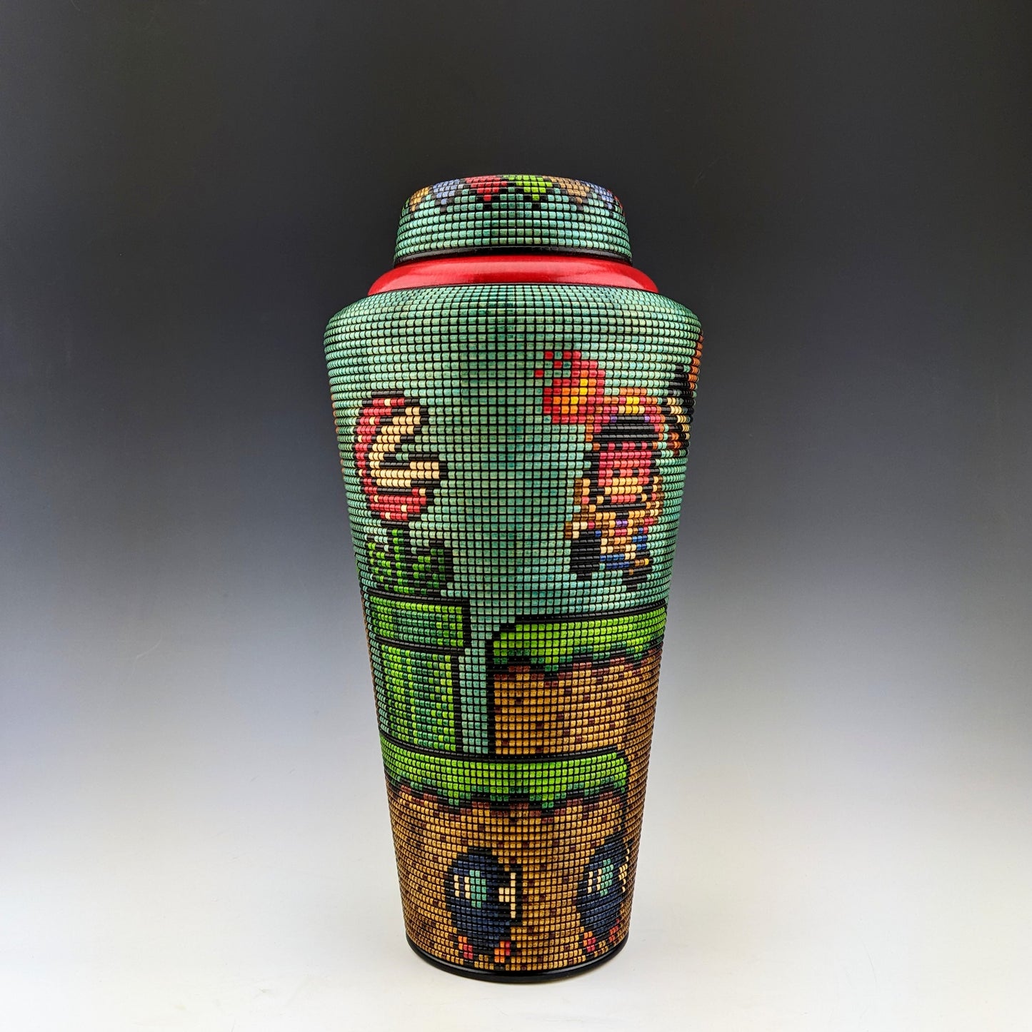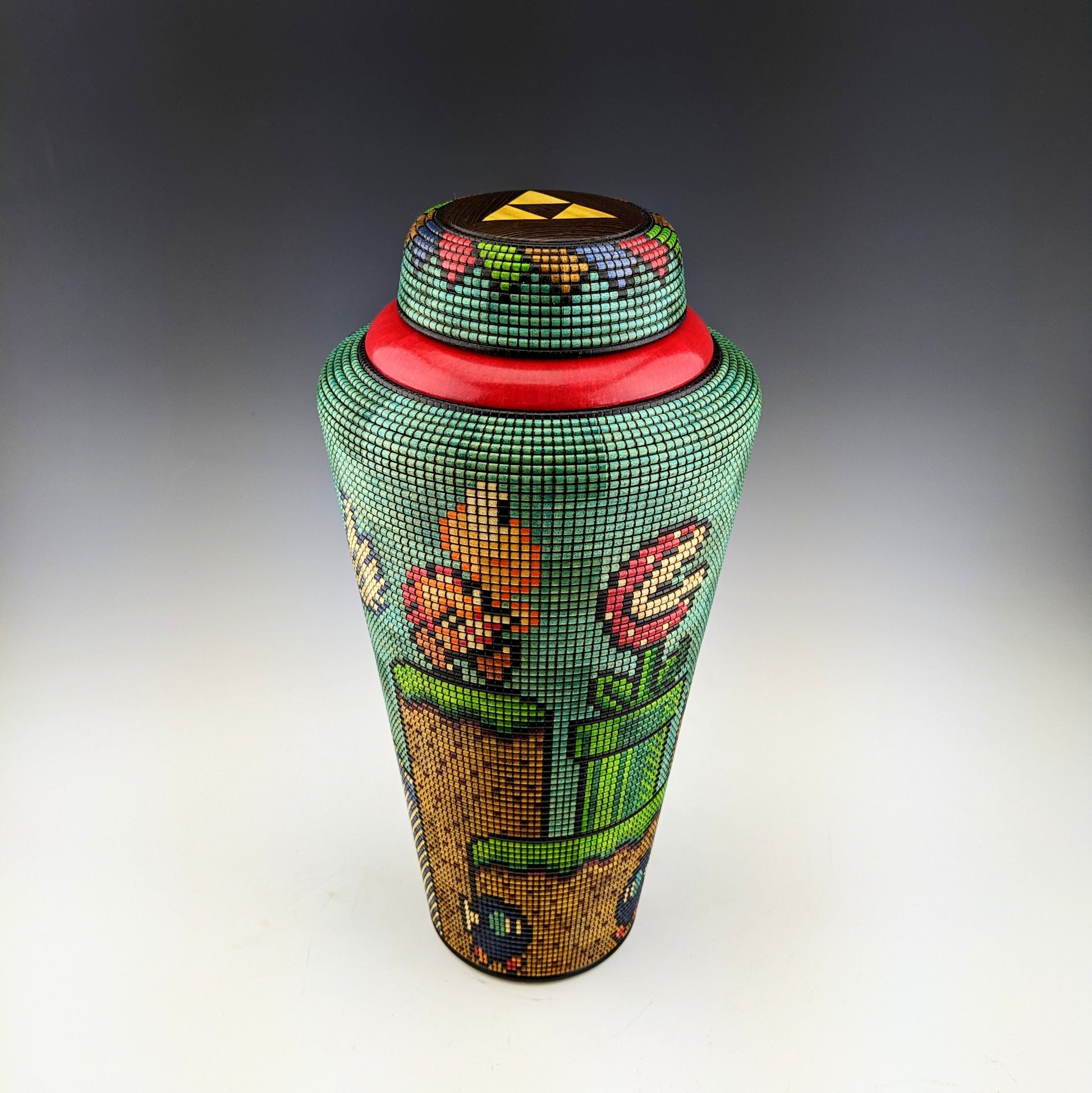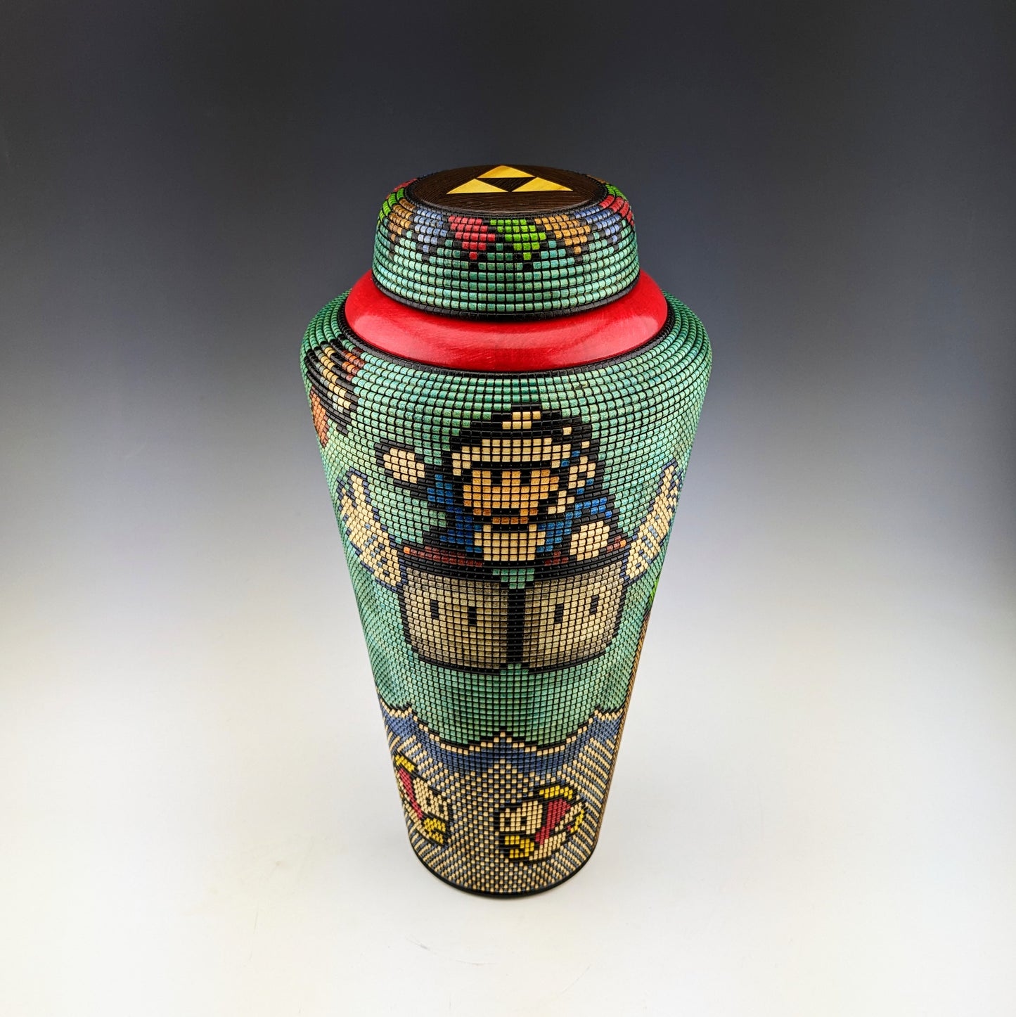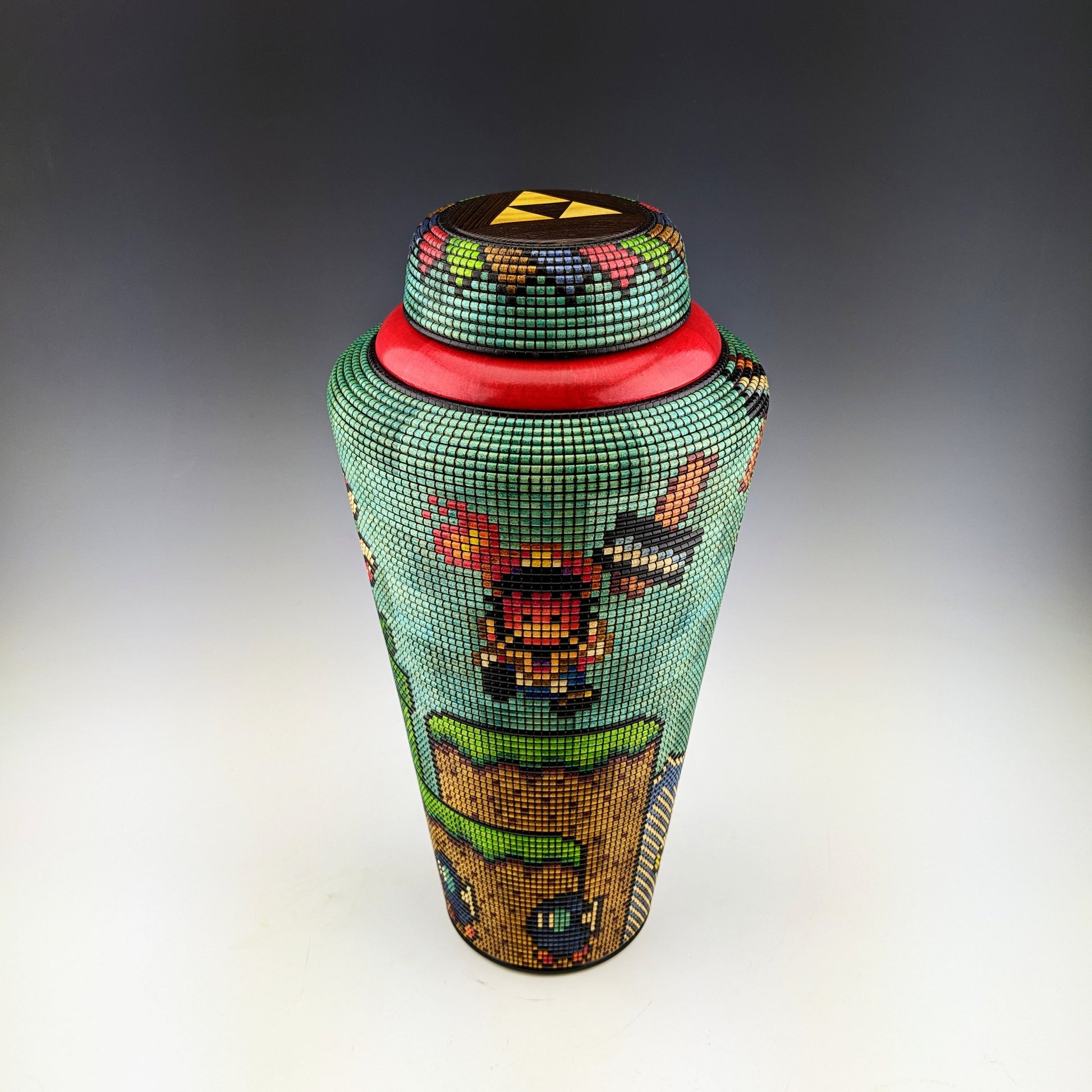 Vase pixelisé avec boite cachée, fait d'érable, wengé et pau amarello.
