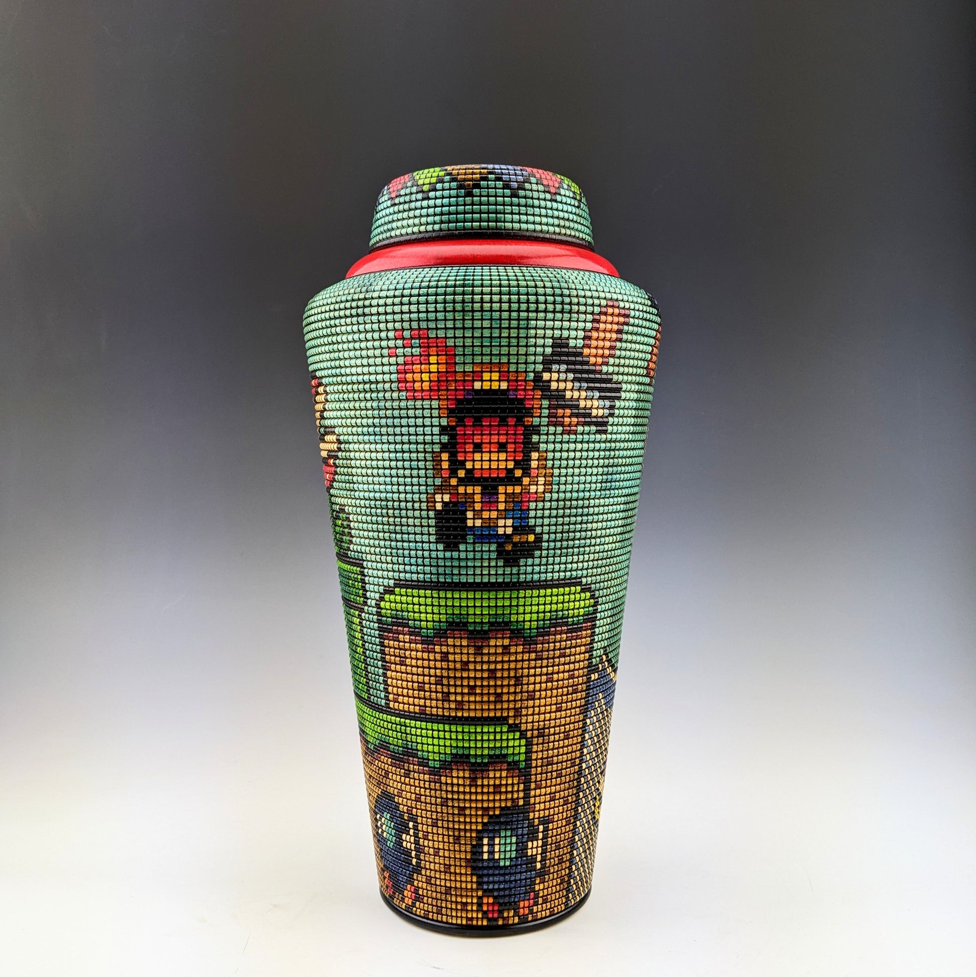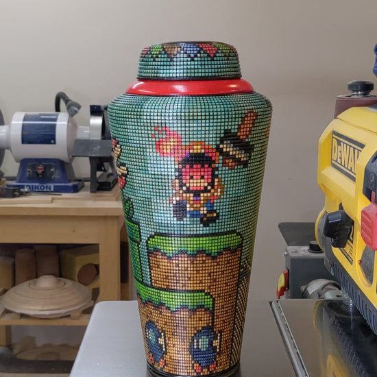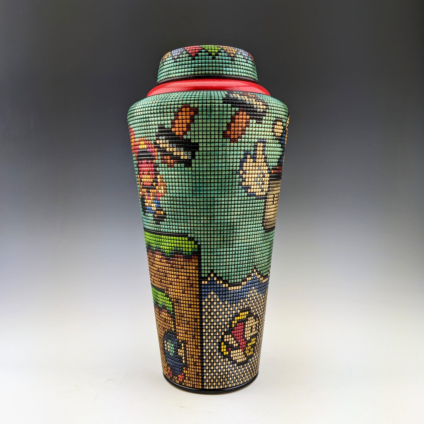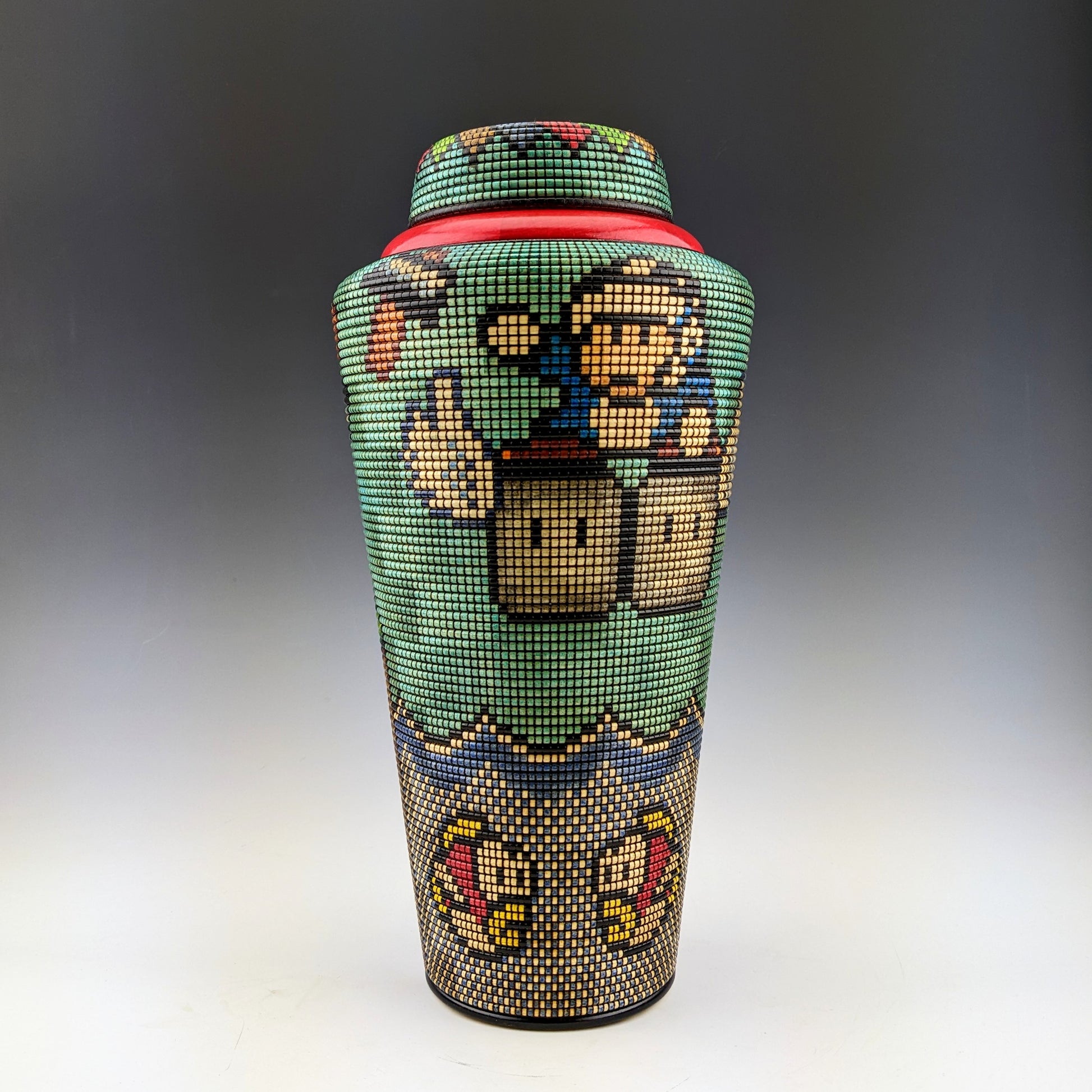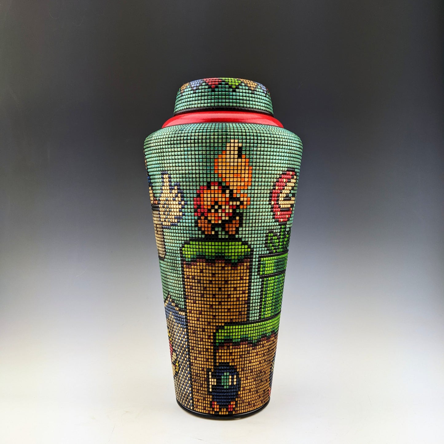 Vase pixelisé avec boite cachée, fait d'érable, wengé et pau amarello.