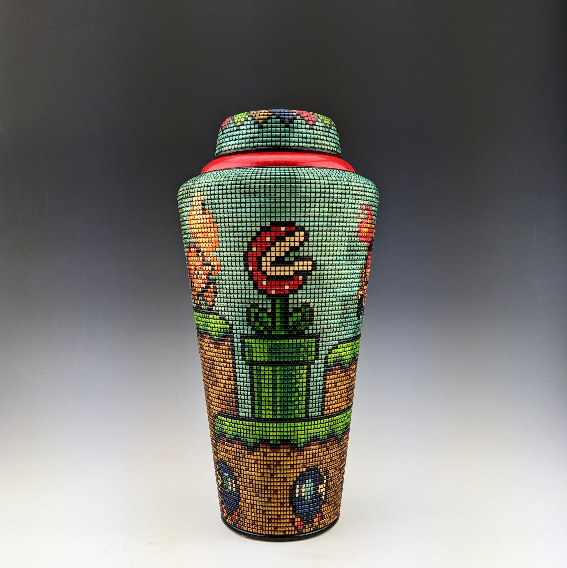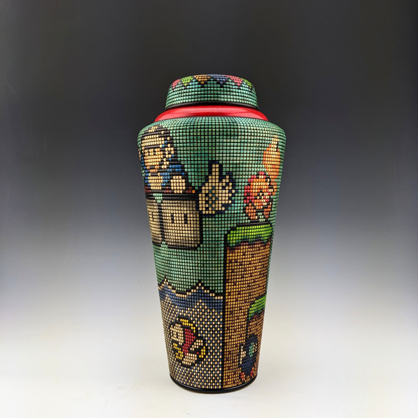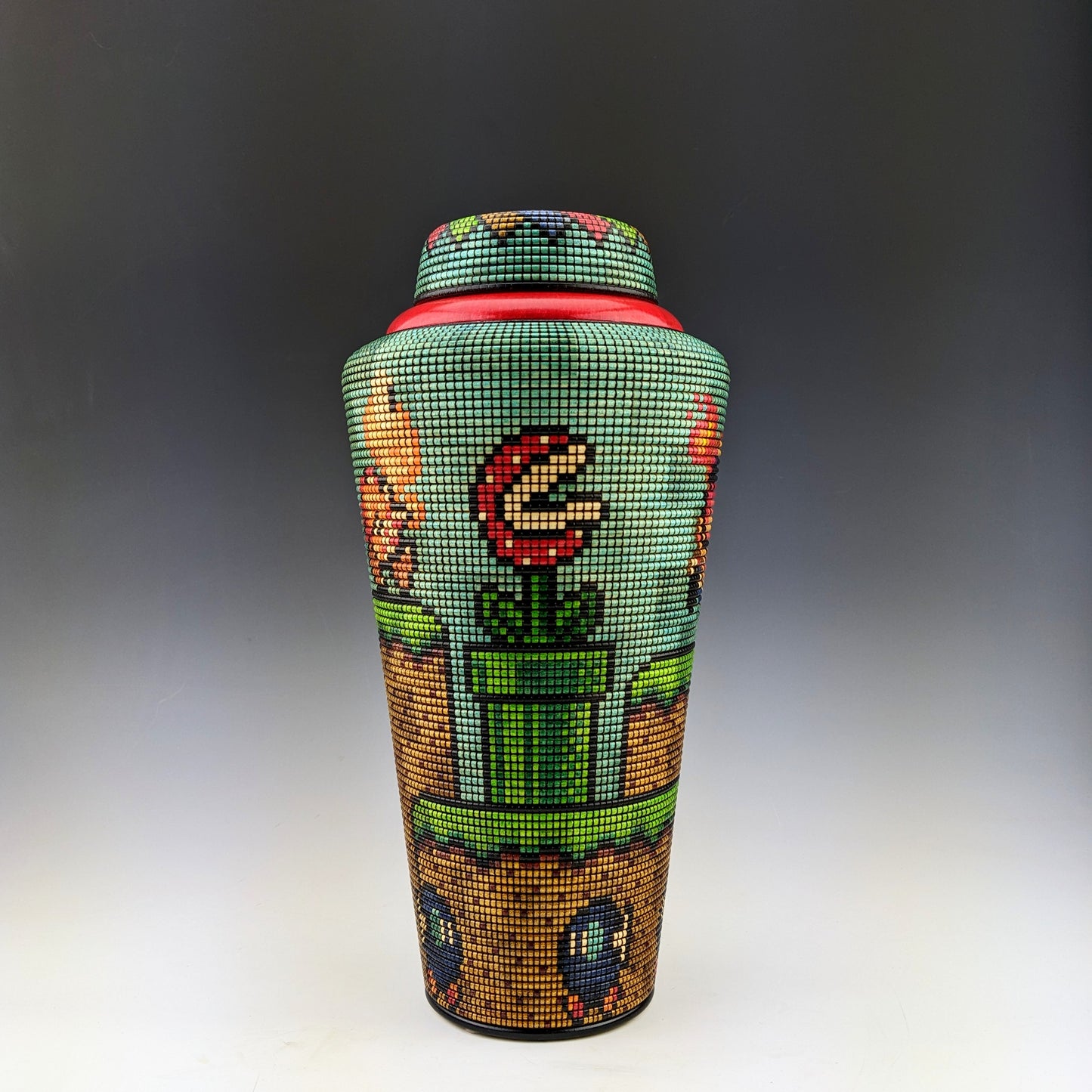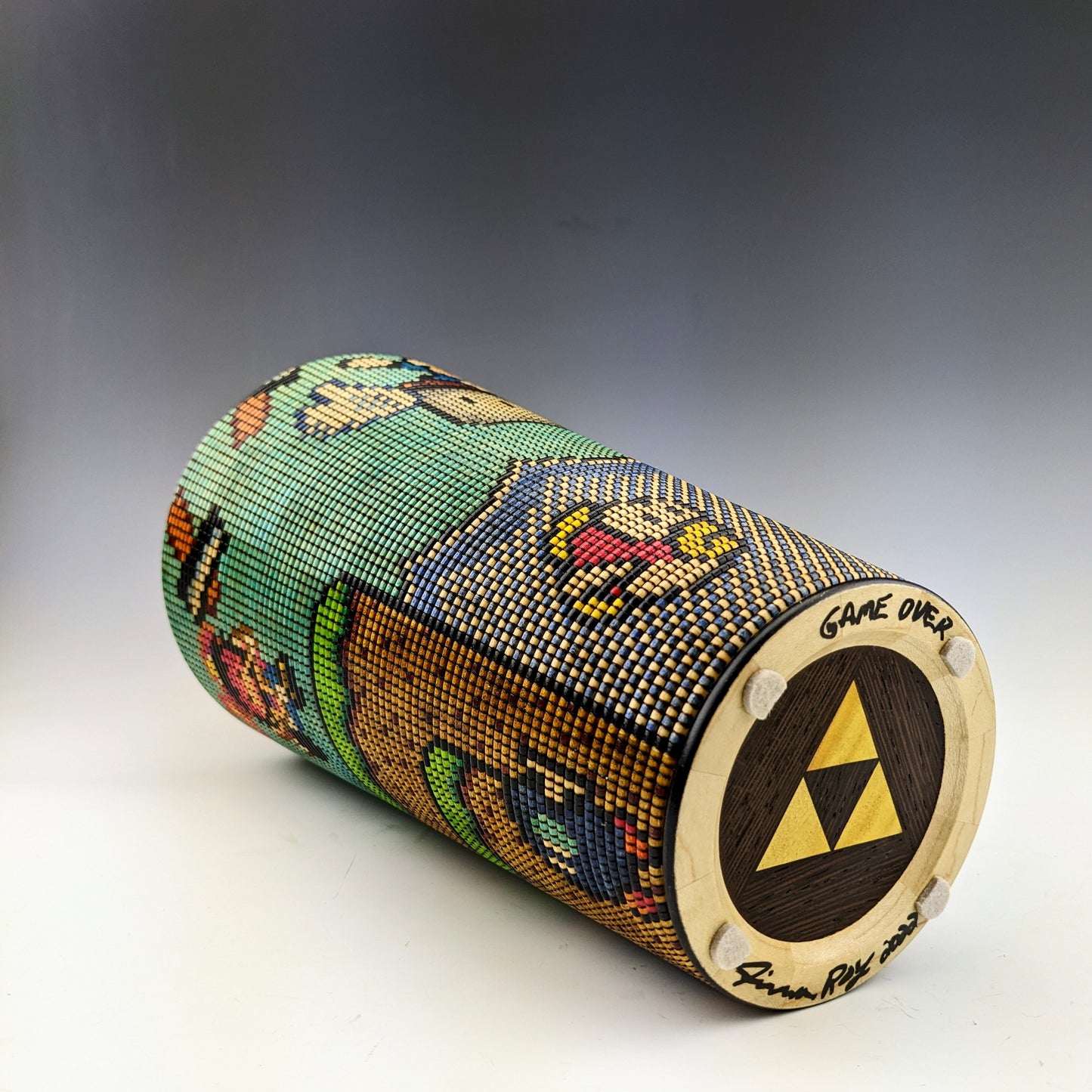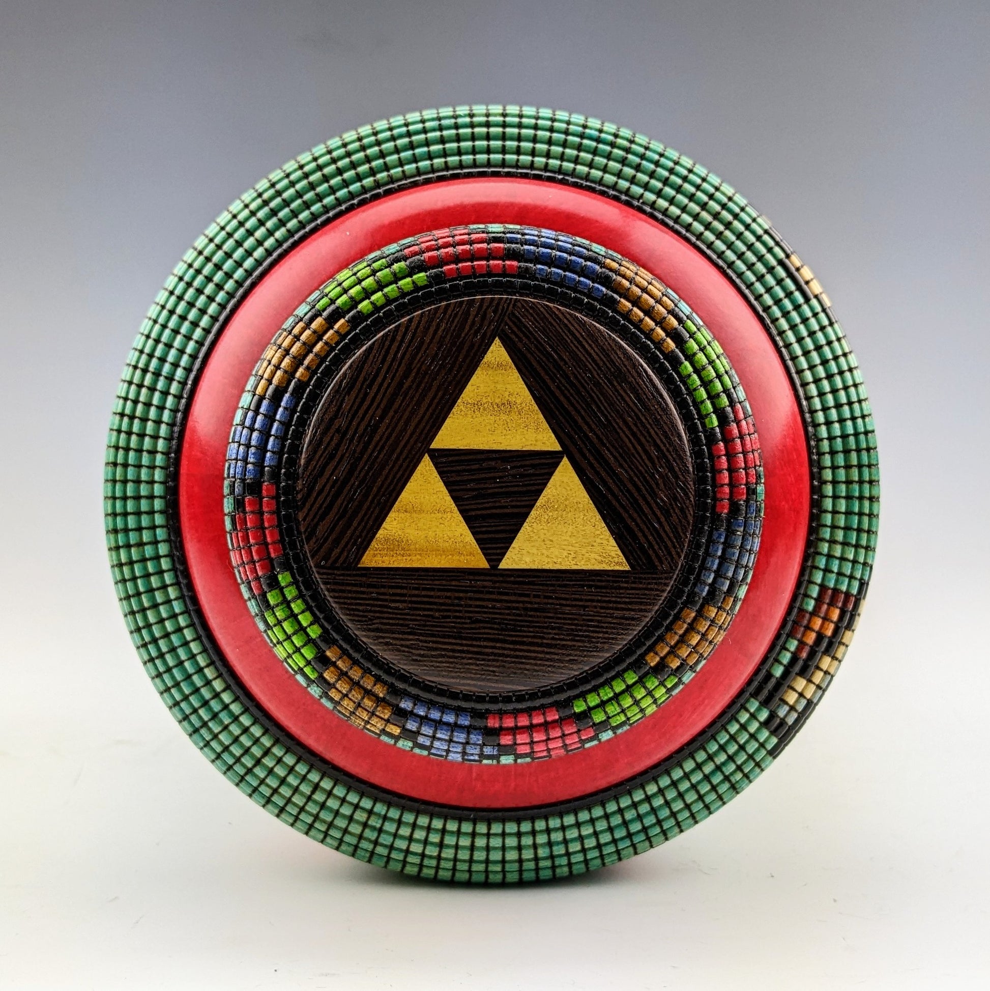 Vase pixelisé avec boite cachée, fait d'érable, wengé et pau amarello.