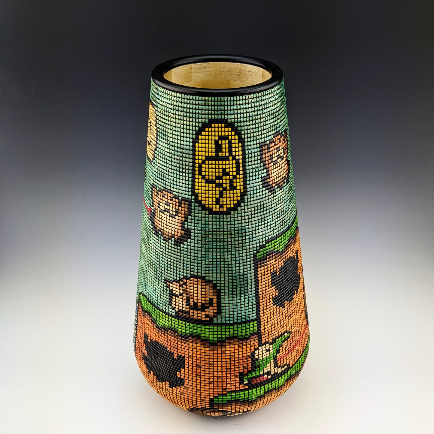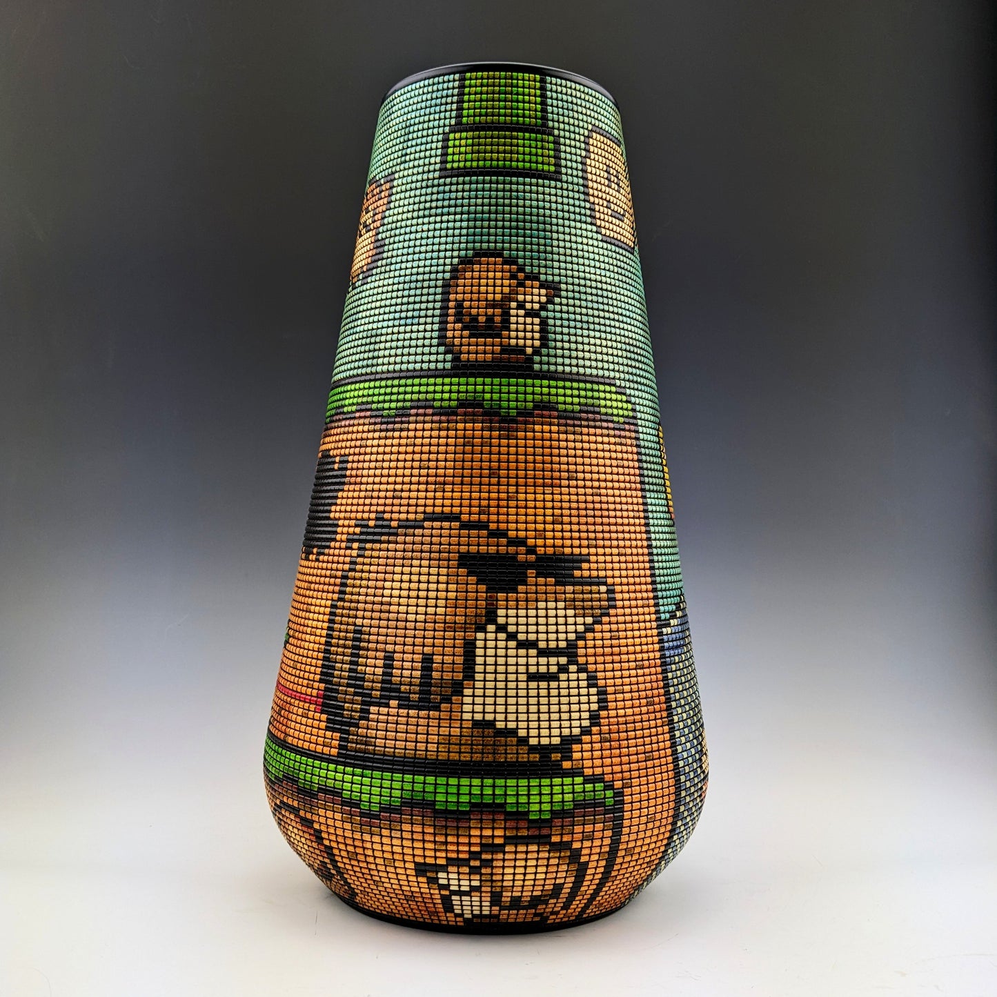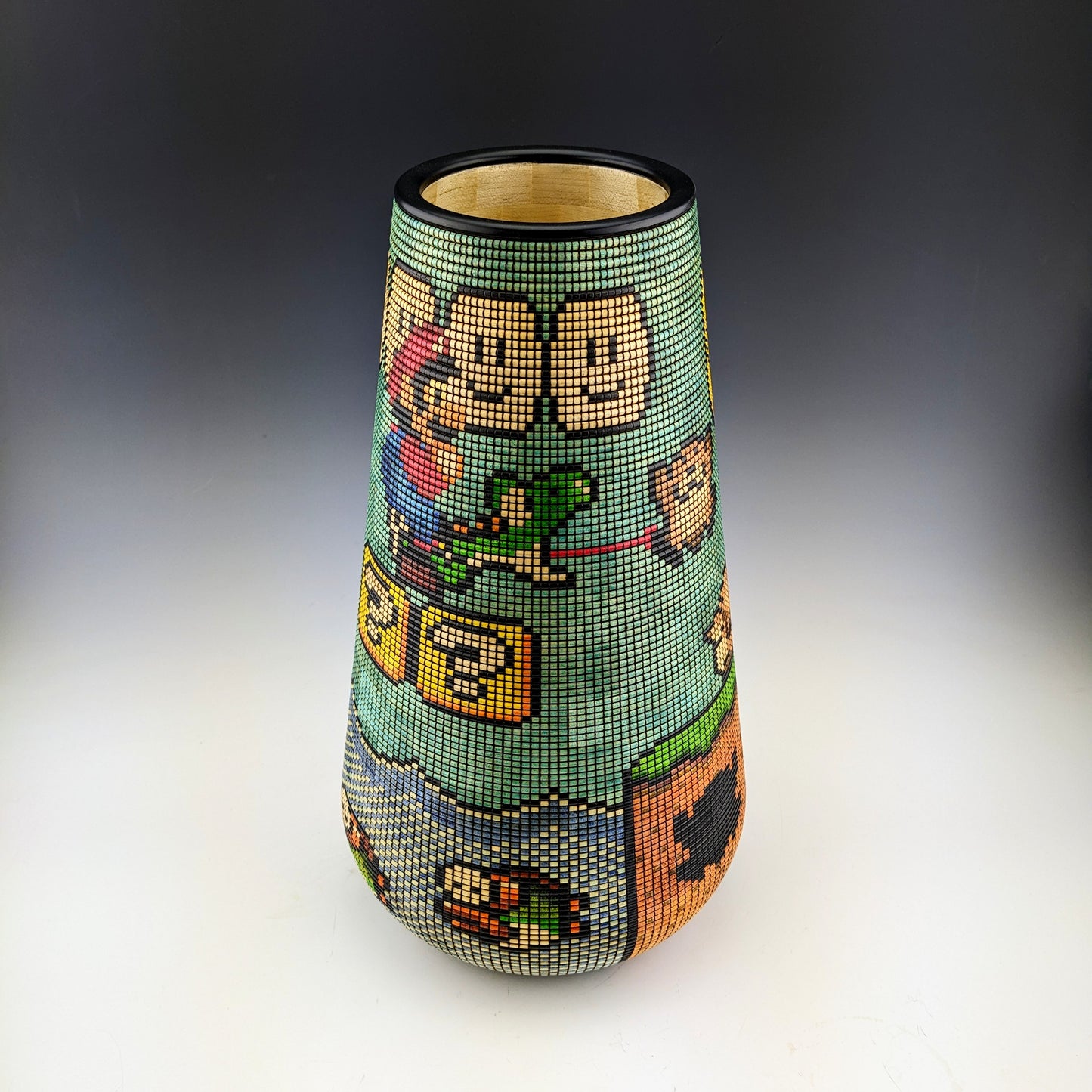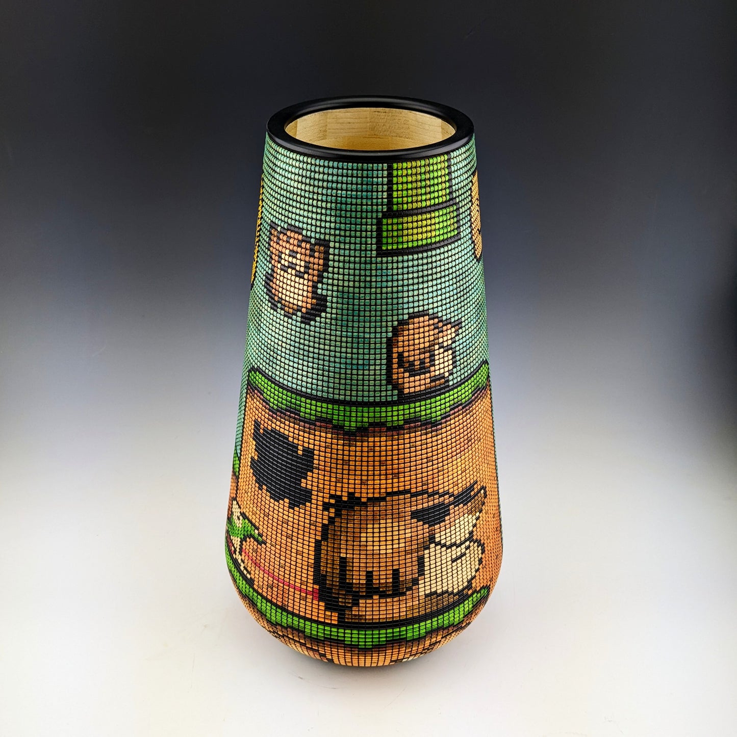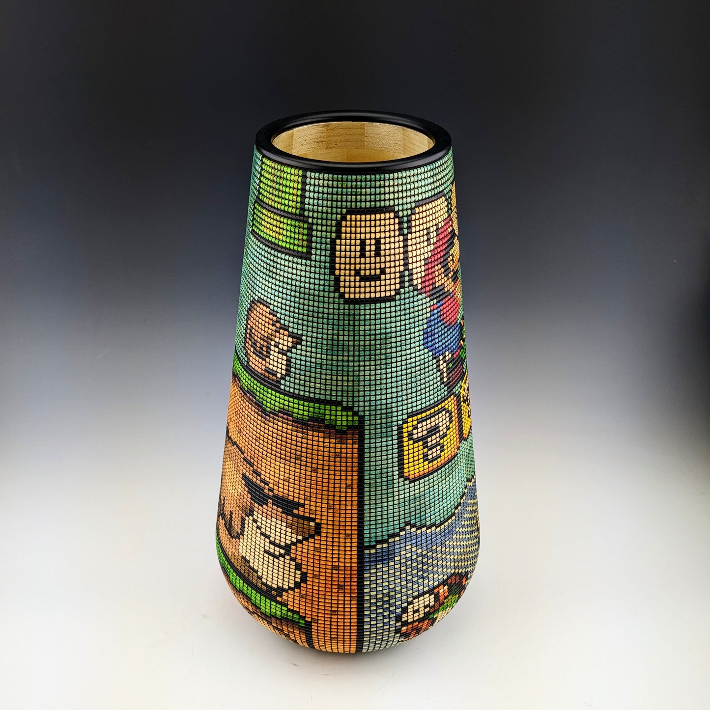 Vase pixelisé fait d'érable, noyer, pau amarello et rubane.