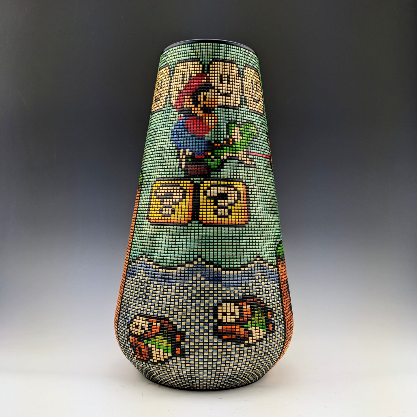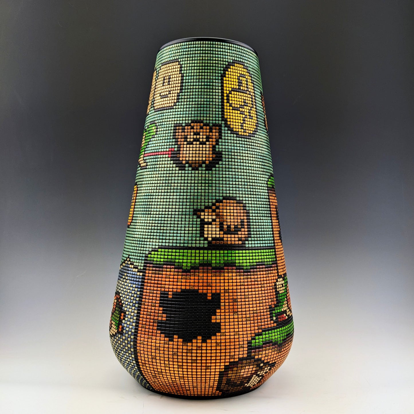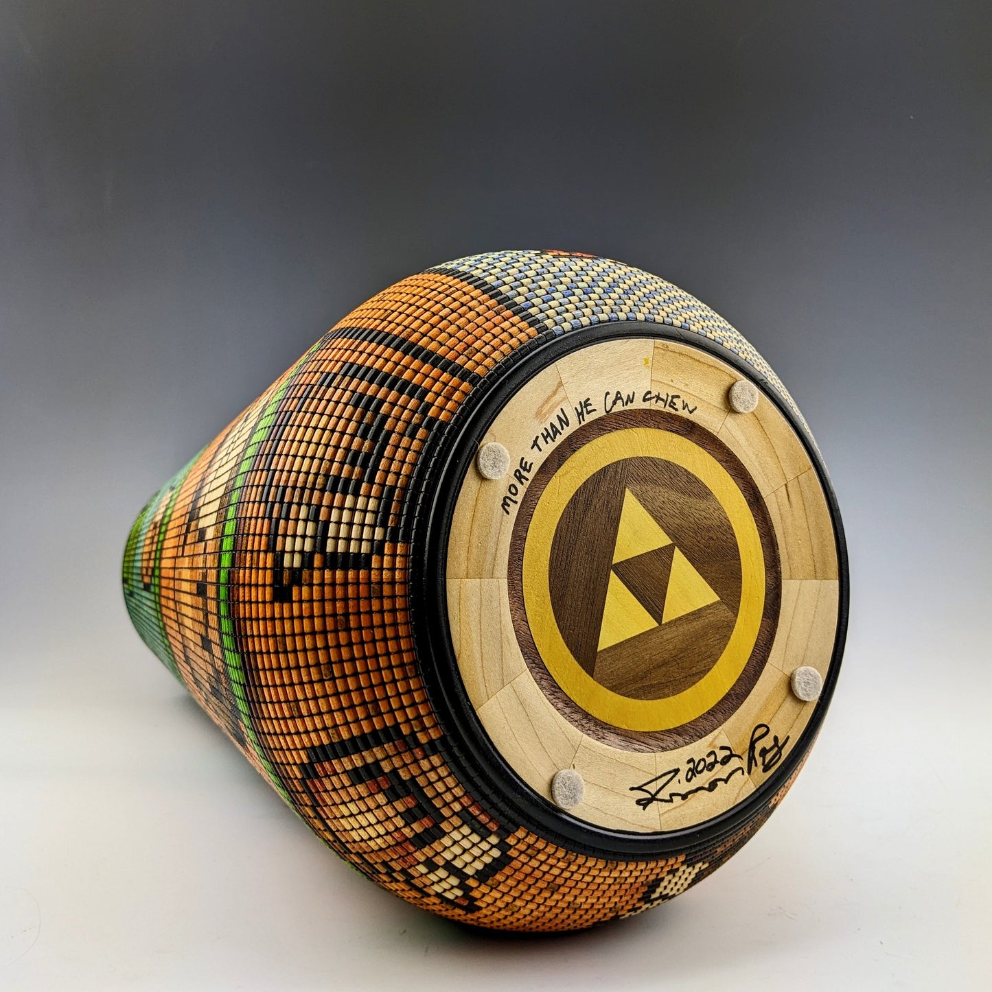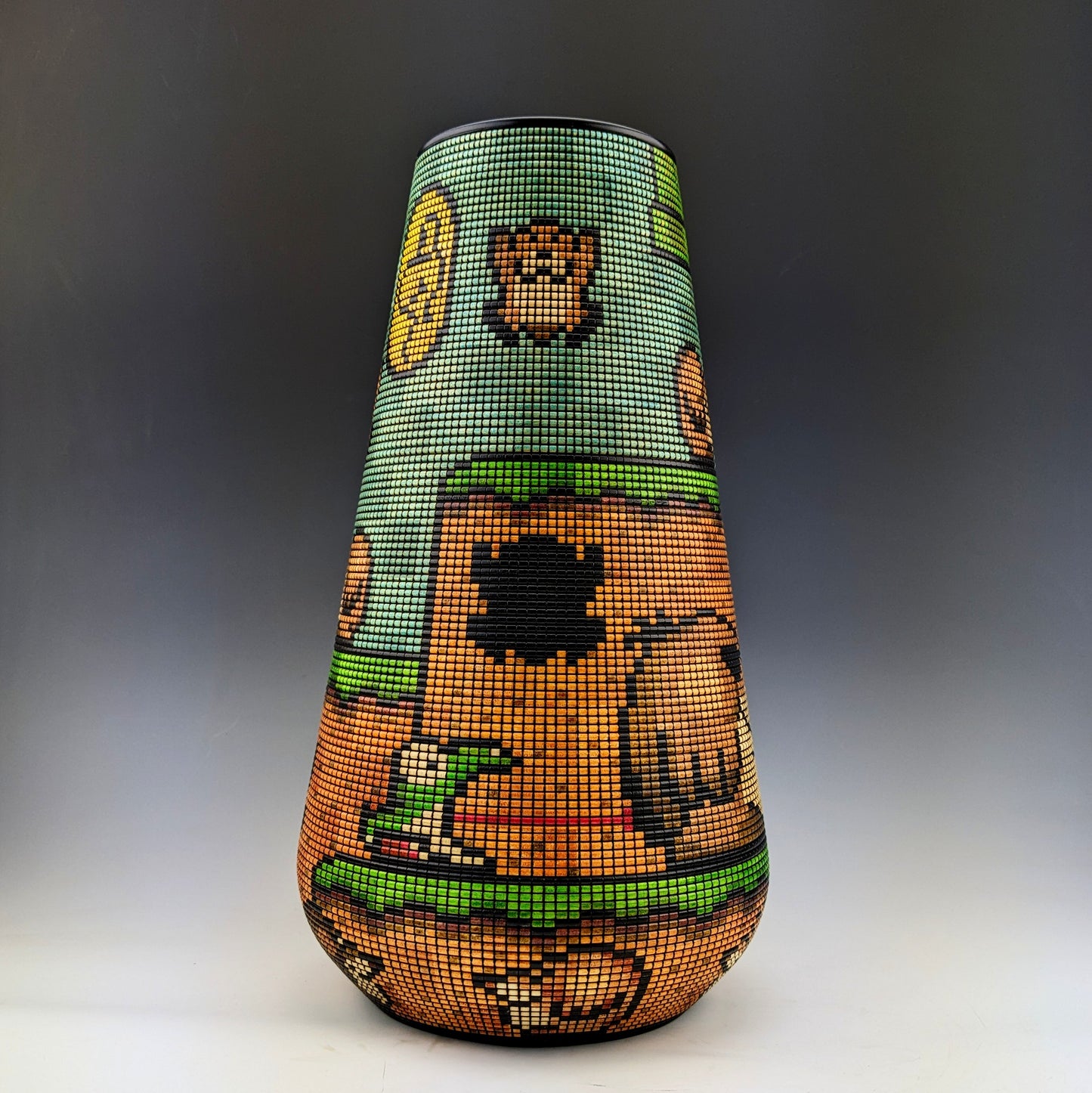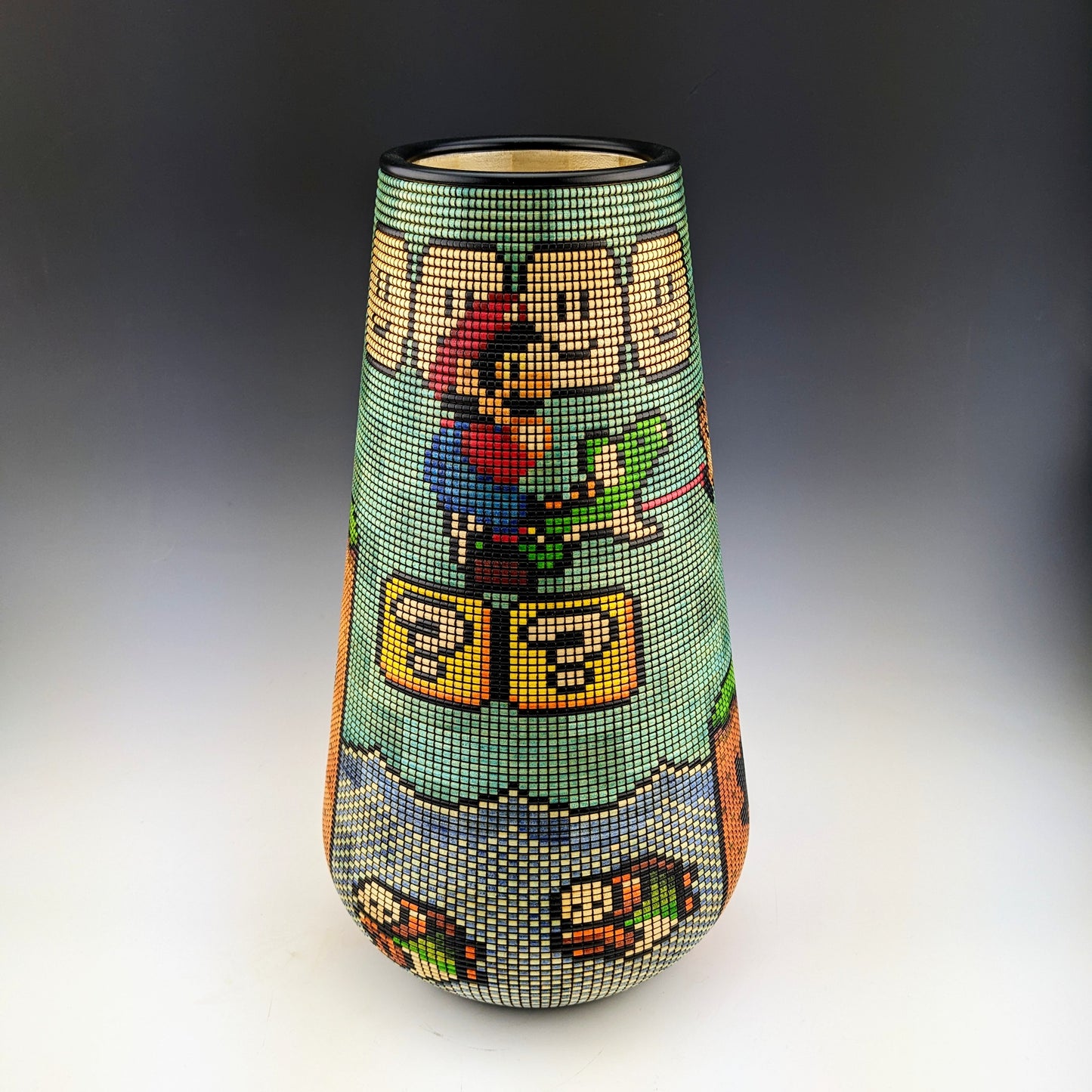 Vase pixelisé fait d'érable, noyer, pau amarello et rubane.