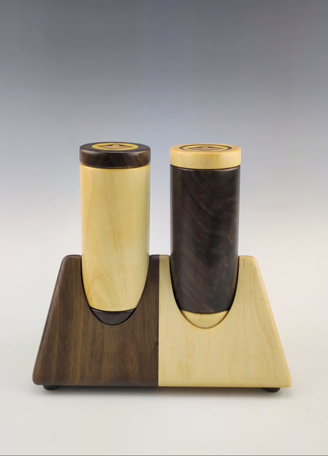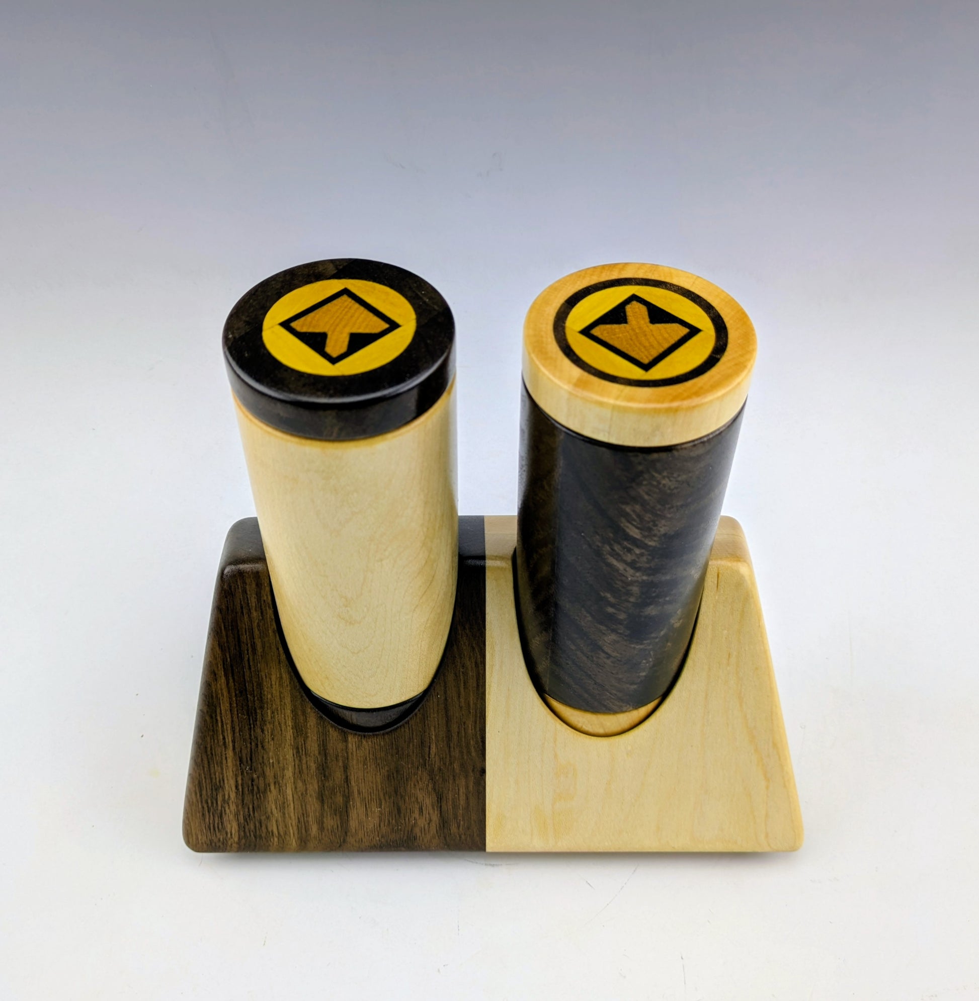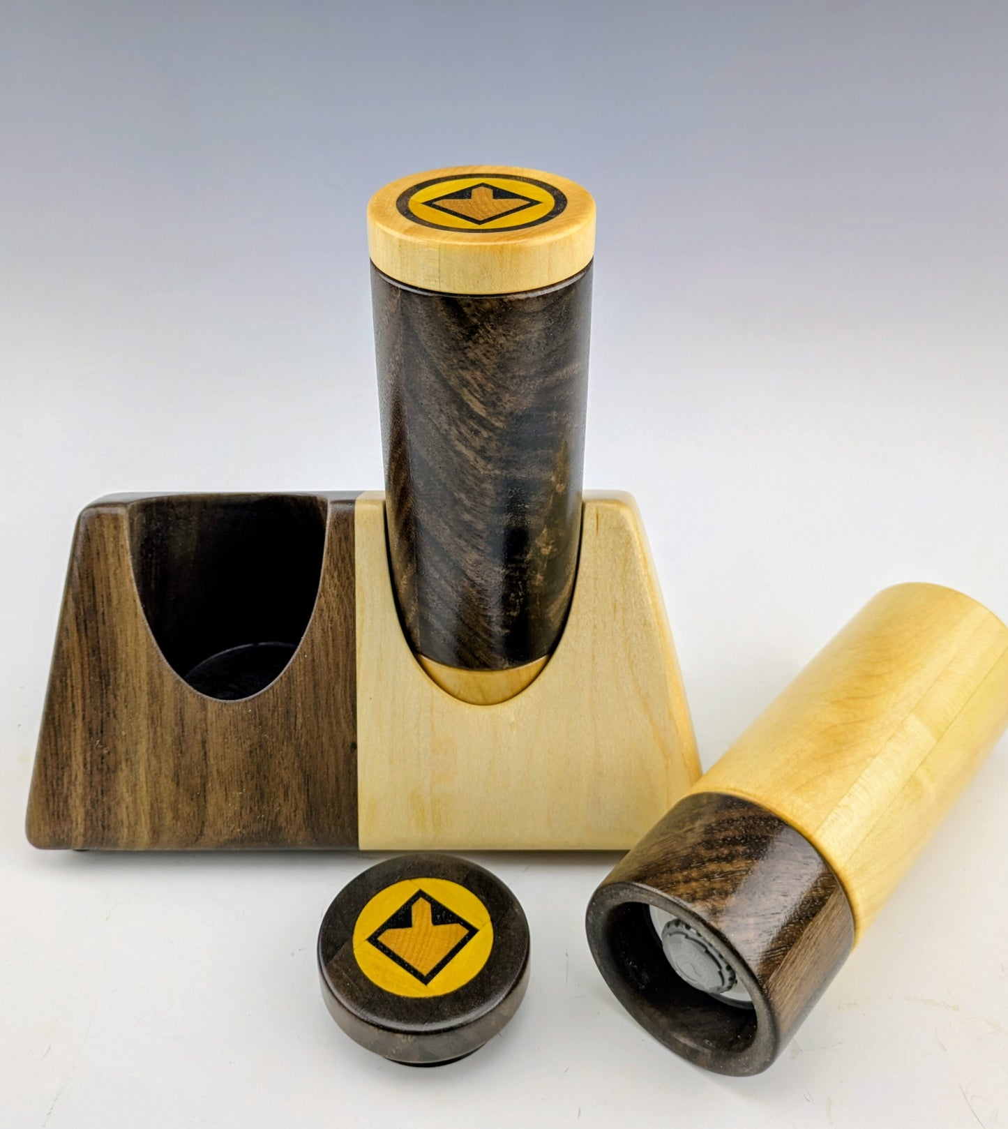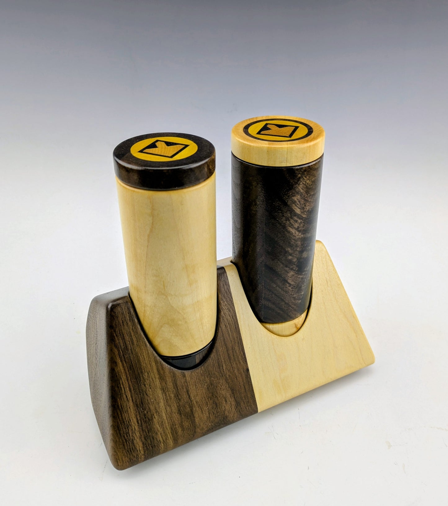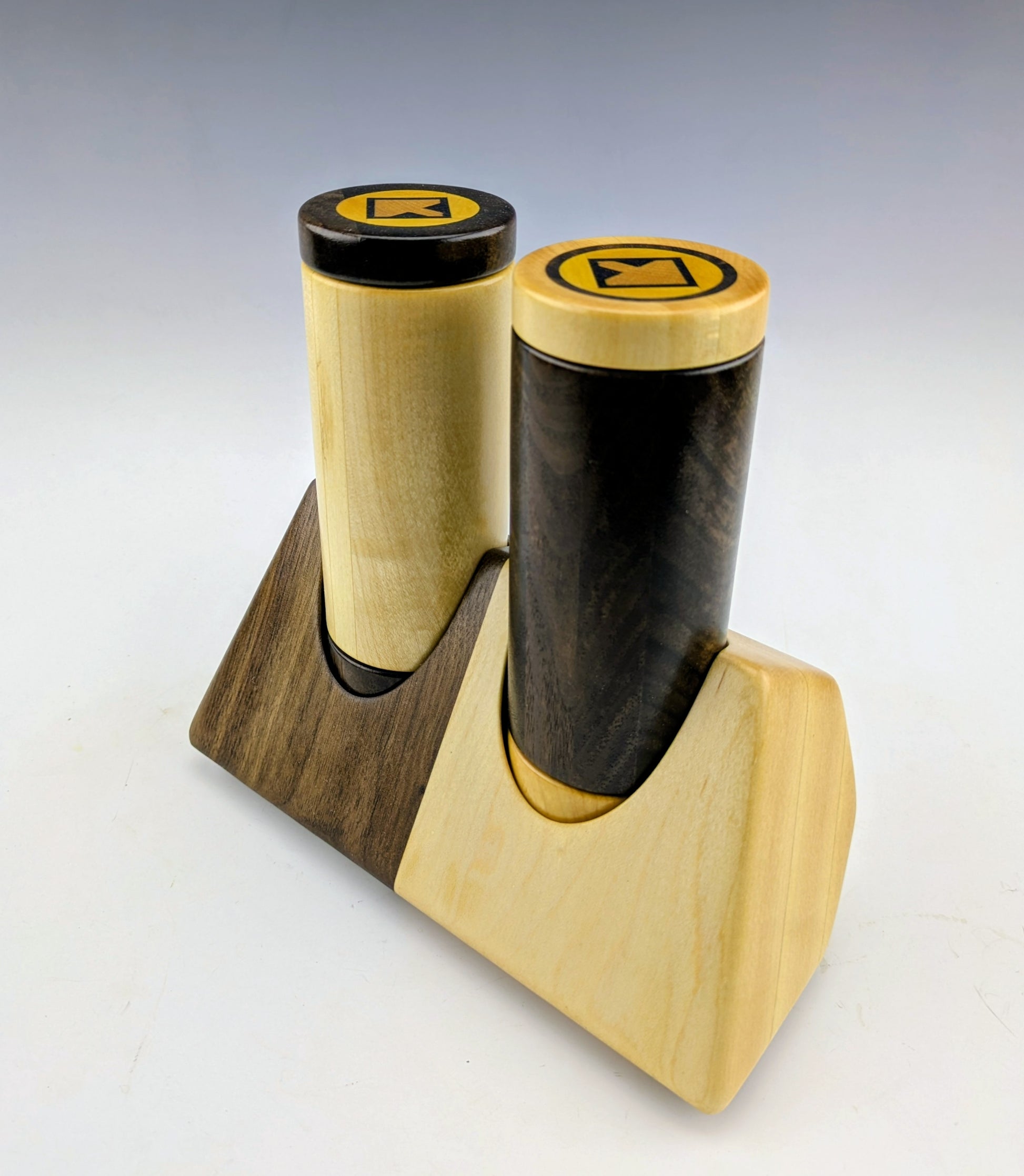 Spice grinder set made of maple, walnut, yellowheart and wenge. I use the Crushgrind ceramic mechanism in all my spice grinders. It is adjustable, and grinds a variety of spices including peppercorn and rock salt.