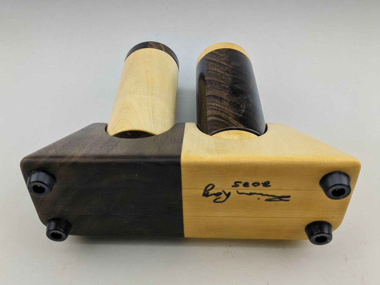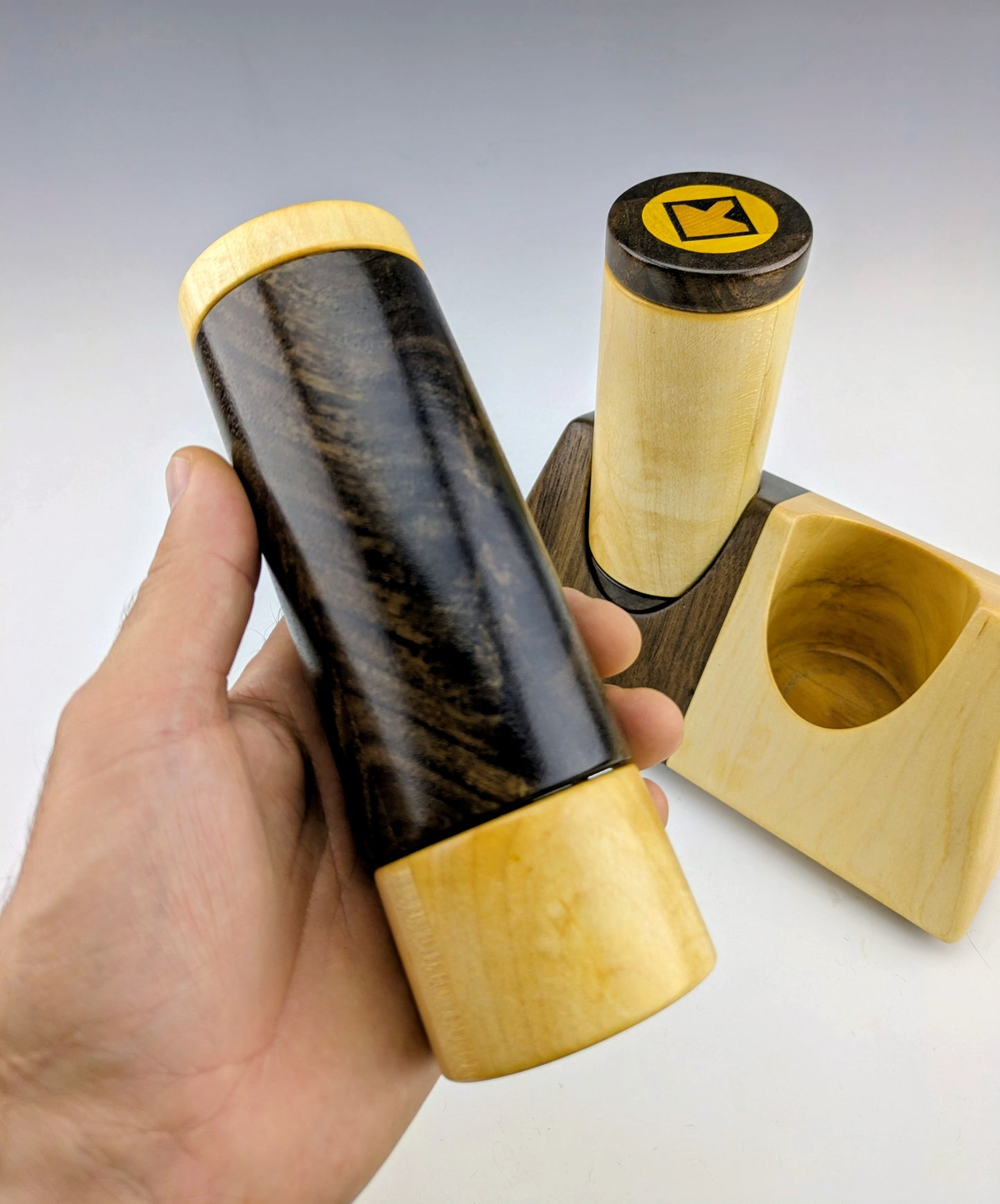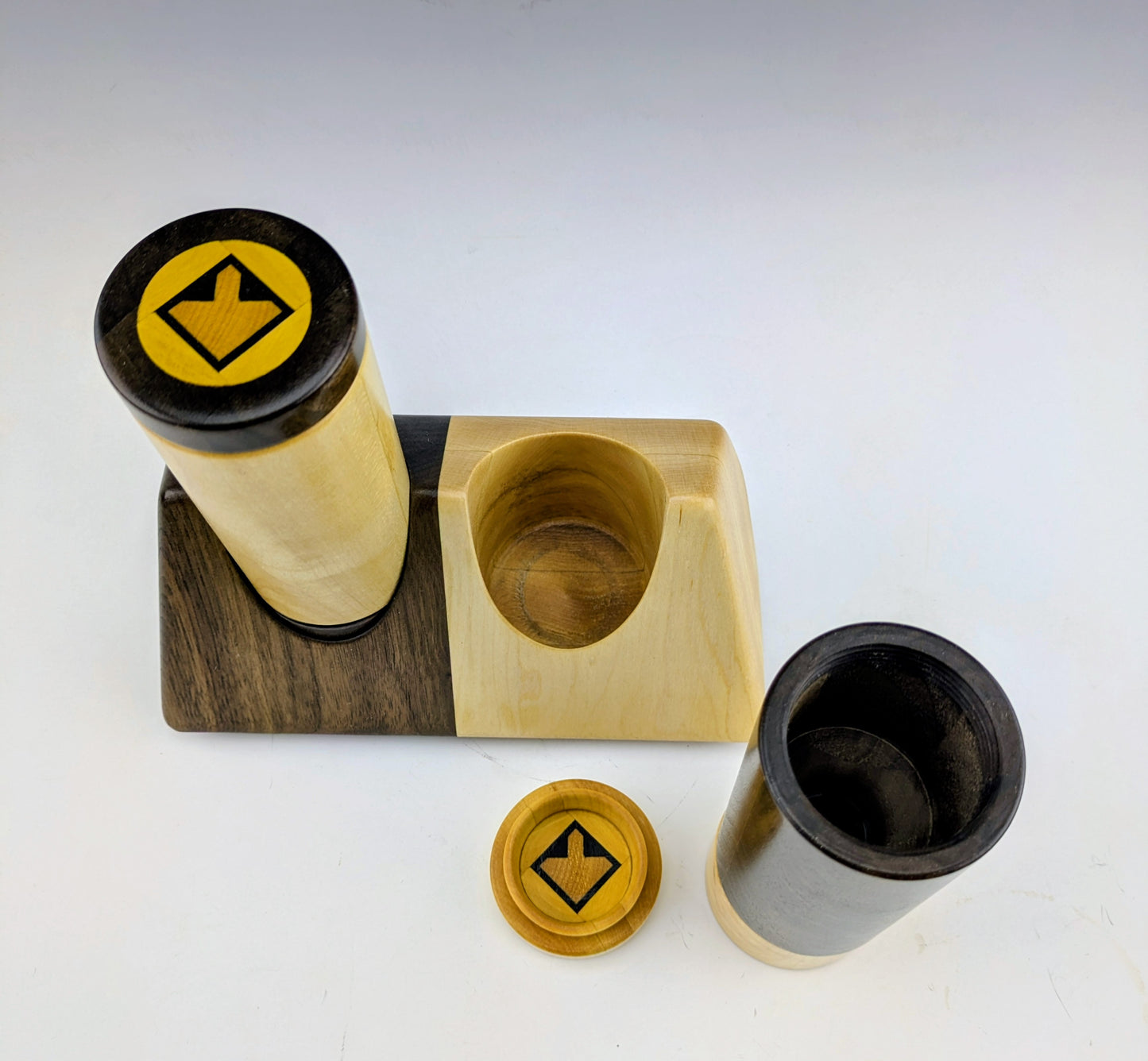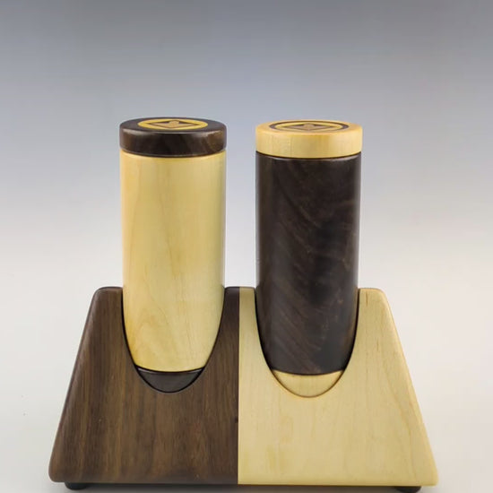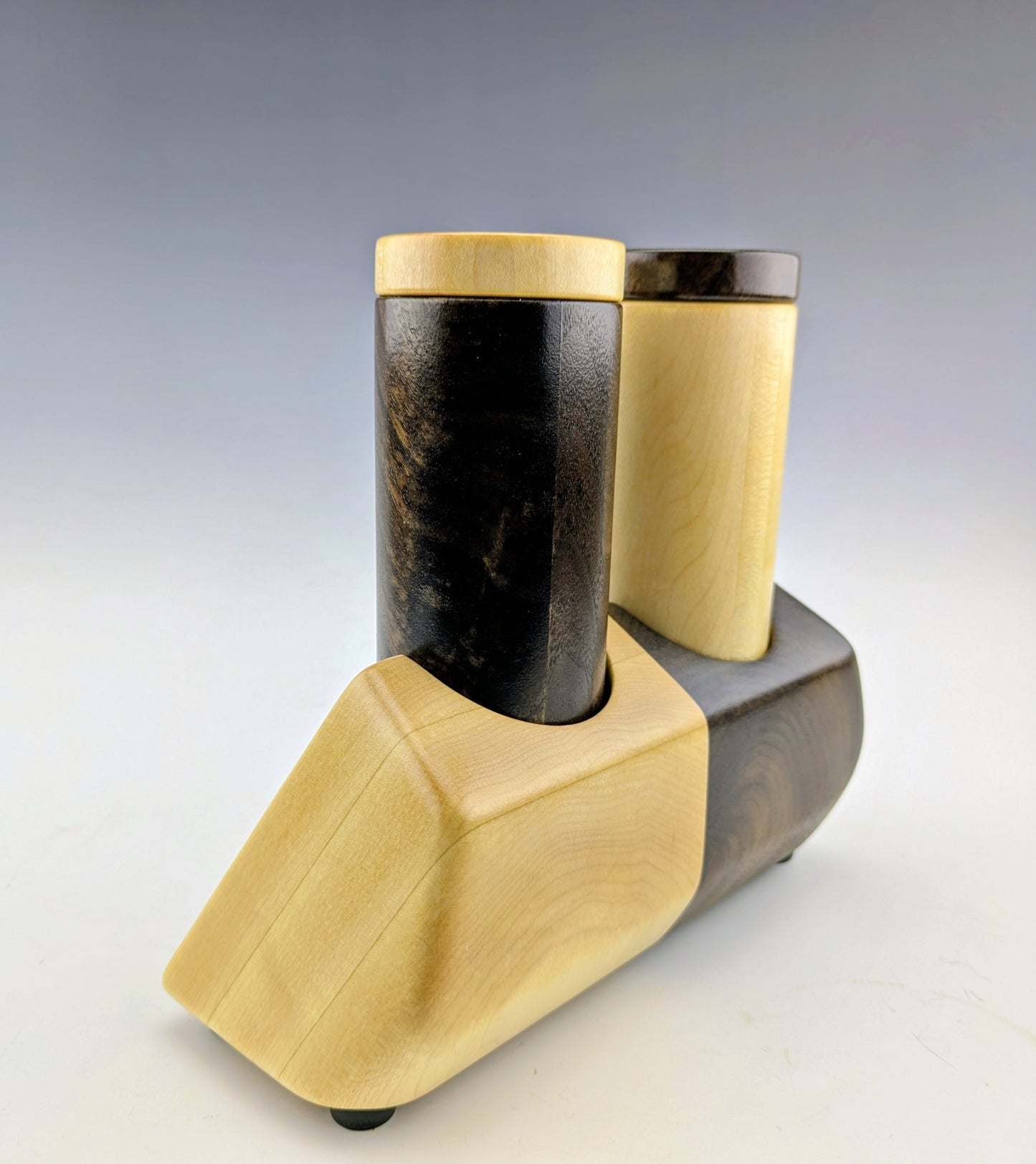 Spice grinder set made of maple, walnut, yellowheart and wenge. I use the Crushgrind ceramic mechanism in all my spice grinders. It is adjustable, and grinds a variety of spices including peppercorn and rock salt.